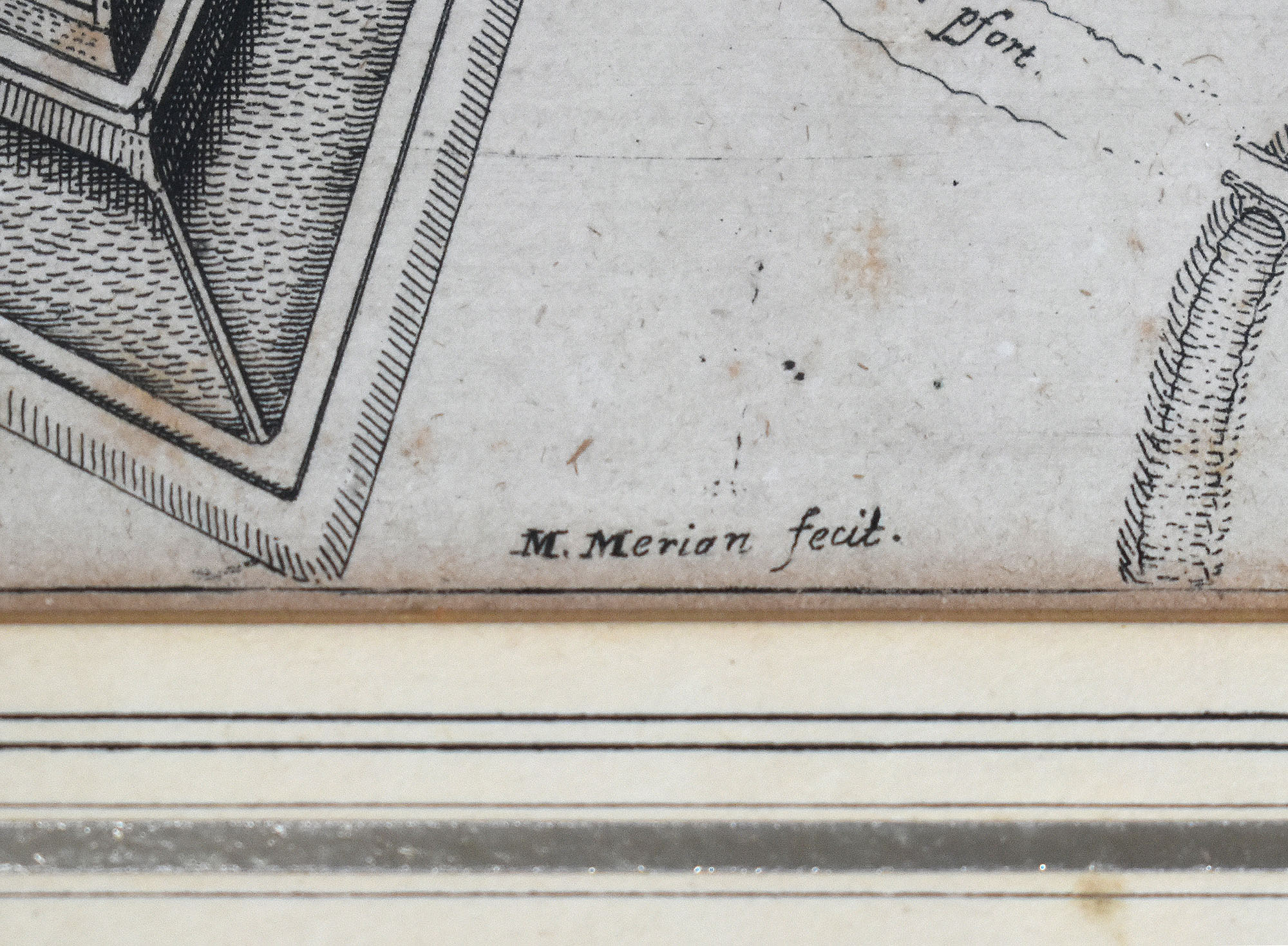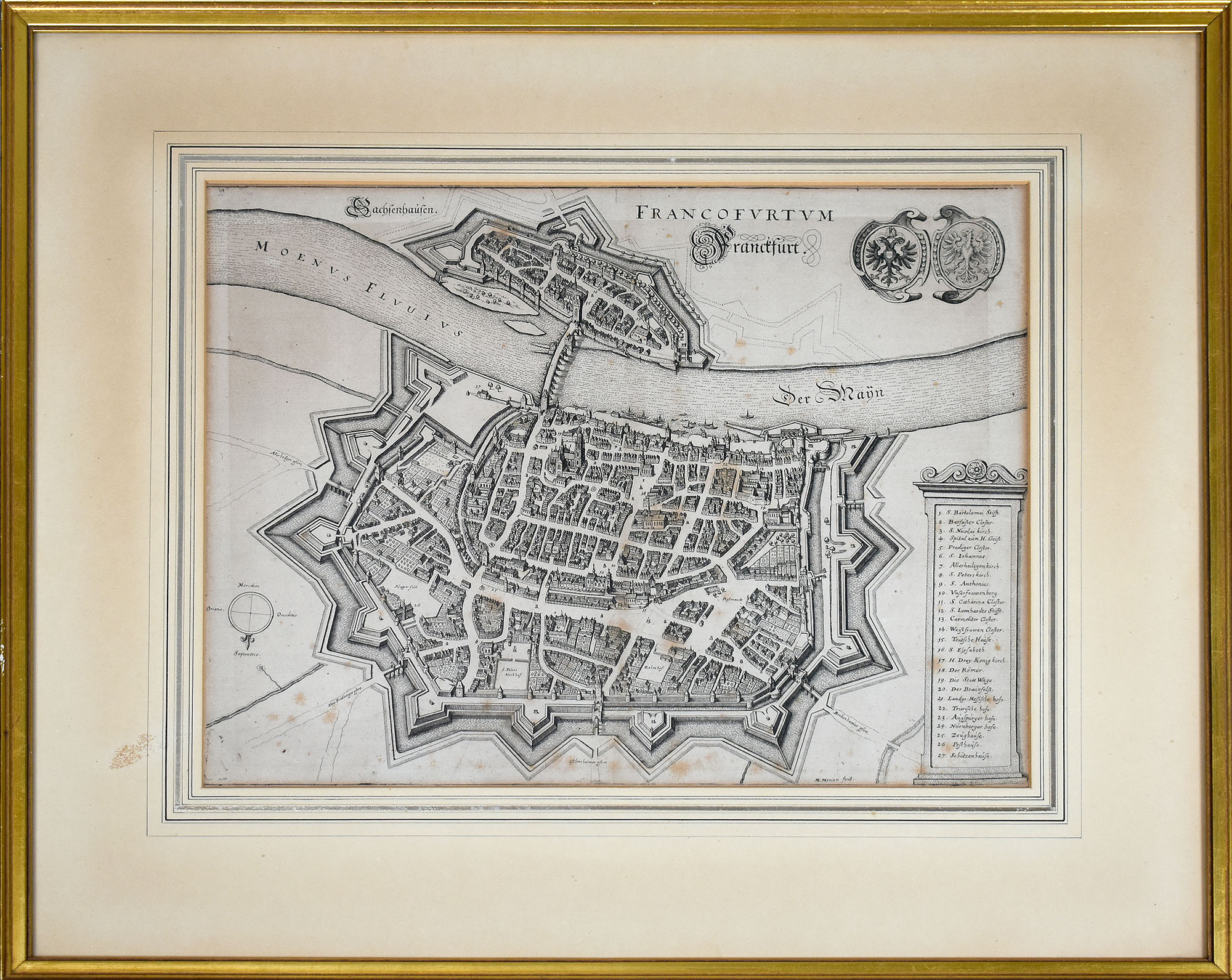 Original-Kupferstich von 1640. Dekorativer Stadtplan von Frankfurt am Main, oben nach Süden ausgerichtet, Legende mit 27 Sehenswürdigkeiten und zwei großen Wappen. Unten rechts am Kartenrand gedruckte Signatur von Matthäus Merian „M. Merian fecit“. Im vergoldeten Holzrahmen hinter Glas/Passepartout gerahmt. Nicht ausgerahmt. Maße Abbildung: 28,0 x 35,0 cm. Maße Rahmen: 45,5 x 53,0 cm. Blatt leicht stockfleckig, Passepartout mit Fleck, Rahmen mit leichten Gebrauchsspuren. Guter bis sehr guter Zustand.