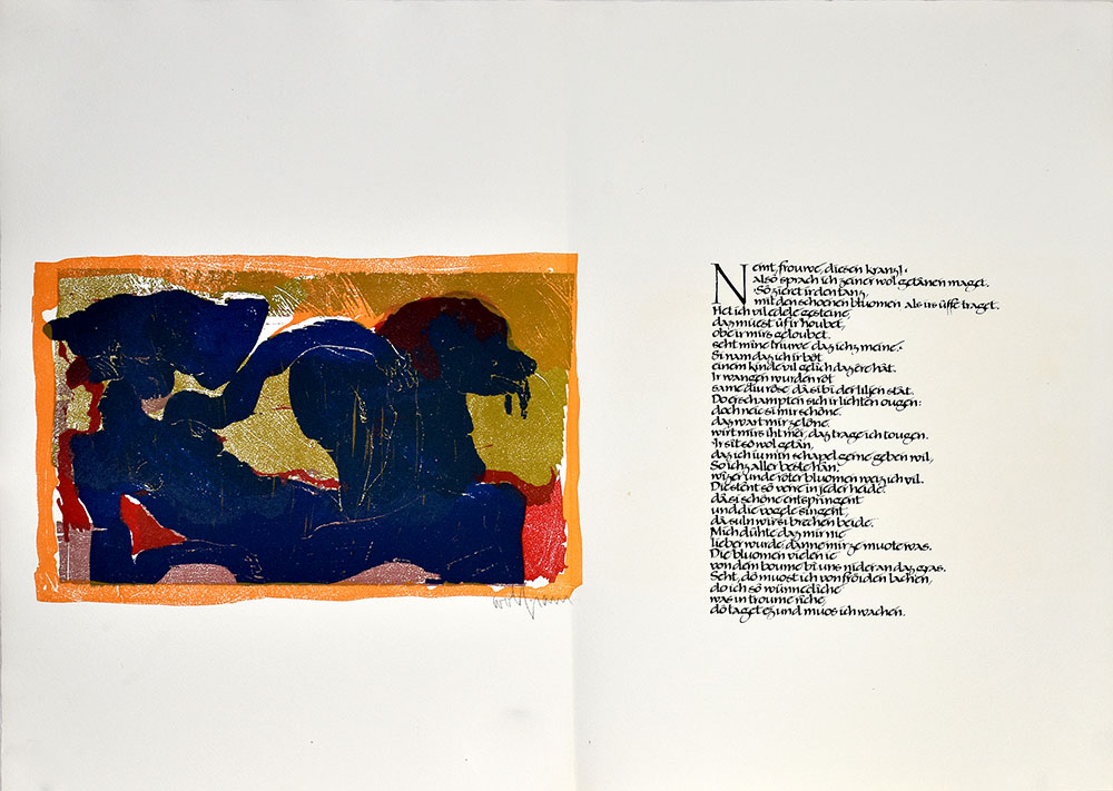 Vogelweide, Walther von der und Wolfram, Peer: Minnelieder. Von Walther von der Vogelweide nebst zwanzig in Holz geschnittene Minnebilder von Peer Wolfram. Wiesbaden, Verlag Offizin Parvus, 1966. Original-Leinenkassette.