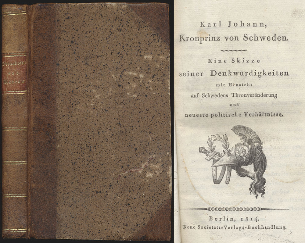 Karl Johann, Kronprinz von Schweden. Eine Skizze seiner Denkwürdigkeiten mit Hinsicht auf Schwedens Thronveränderung und neueste politische Verhältnisse. Berlin, Neue Societäts-Verlags-Buchhandlung, 1814. Klein-8°. 17,5 x 11,5 cm. IV Seiten, 1 Blatt, 126 Seiten, 1 Blatt. Halblederband der Zeit mit rotem, ledernem Rückenschild, goldgeprägtem Rückentitel und Fileten sowie Rundum-Gelbschnitt und marmoriertem Vorsatzpapier.
