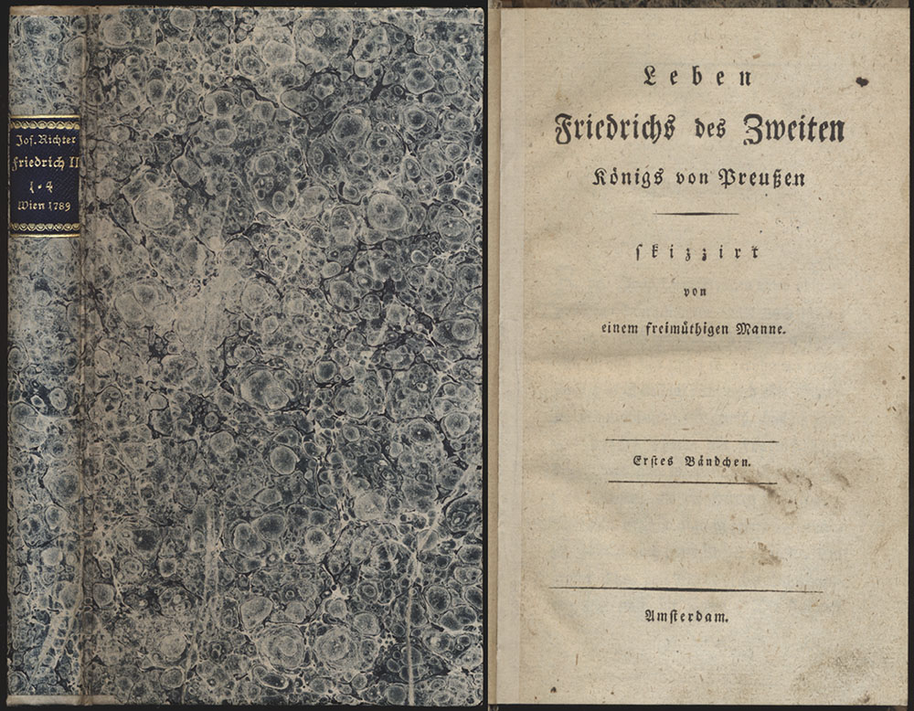 [Richter, Joseph]: Leben Friedrichs des Großen, Königs von Preußen. Skizzirt von einem freimüthigen Manne. Erstes [bis] viertes Bändchen (in einem Band, komplett). Amsterdam [i.e. Wien], [Verlag Wucherer], [1789]. Klein-8°. 18 x 11 cm. 90, 78, 96, 88 Seiten. Späterer, marmorierter Pappband mit blauem Rückenschild und goldgeprägtem Rückentitel sowie Sprengschnitt.