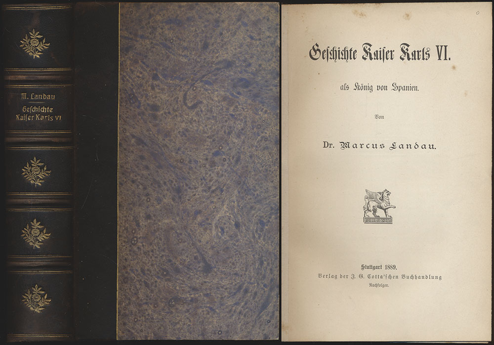 Landau, Marcus: Geschichte Kaiser Karls VI. als König von Spanien. Stuttgart, Verlag J. G. Cotta Nachfolger, 1889. Groß-8°. 23 x 16,5 cm. XII, 680 Seiten. Halblederband der Zeit auf vier Bünden mit goldgeprägtem Rückentitel, Fileten und weiteren floralen Ornamenten sowie schwarzem Kopfschnitt.