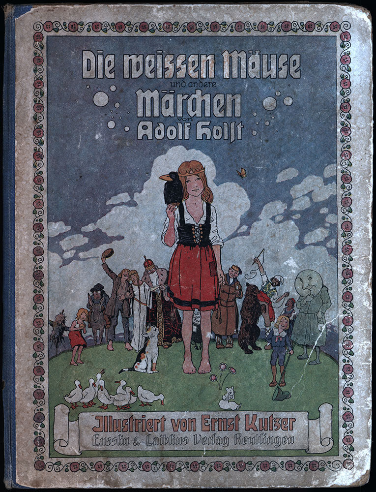Holst, Adolf; Kutzer, Ernst: Die weißen Mäuse und andere Märchen. Reutlingen, Enßlin & Laiblin, [1920]. 4°. 30,5 x 23 cm. 36 Seiten. Klammergehefteter Original-Halbleinenband mit farbiger Deckelillustration.