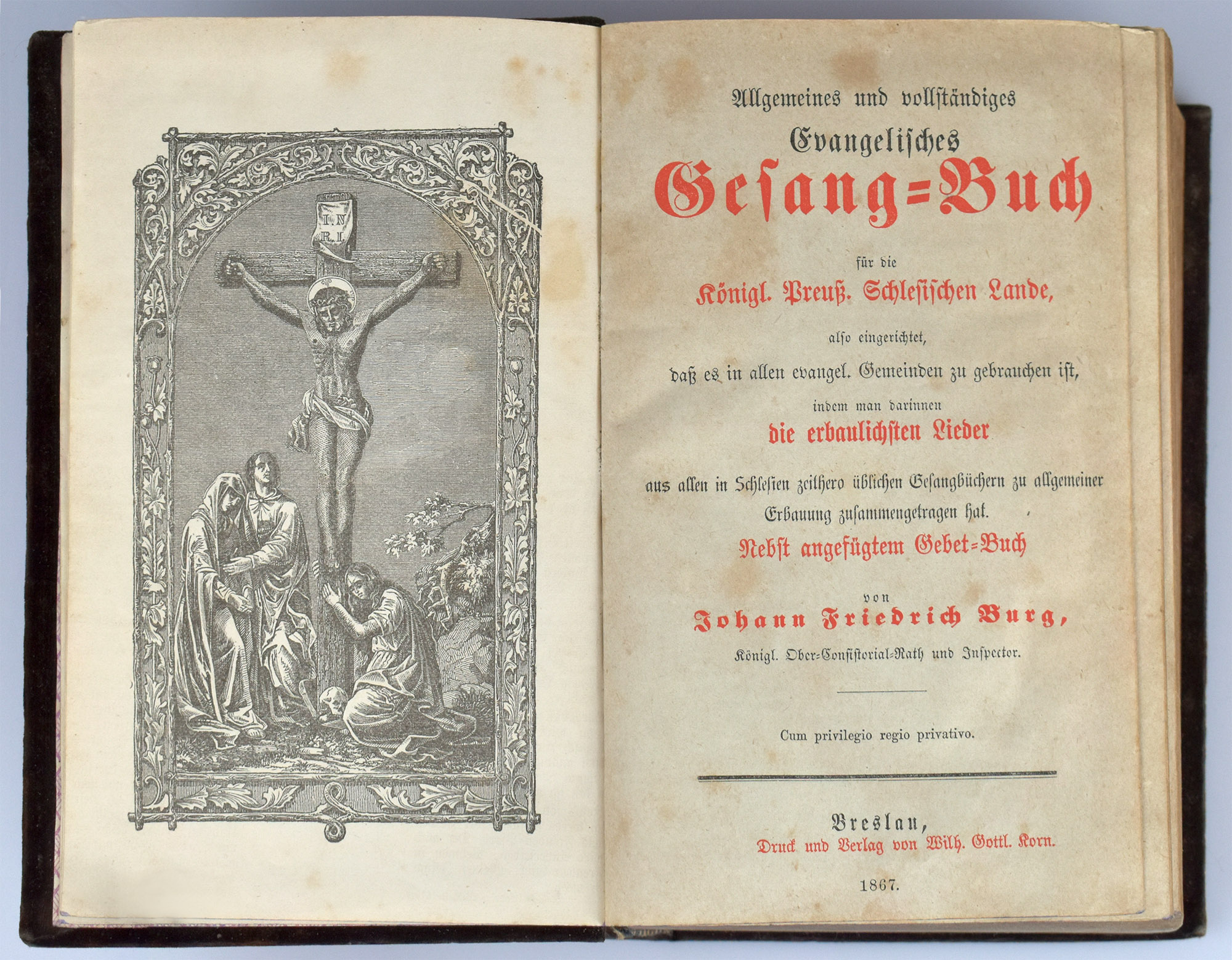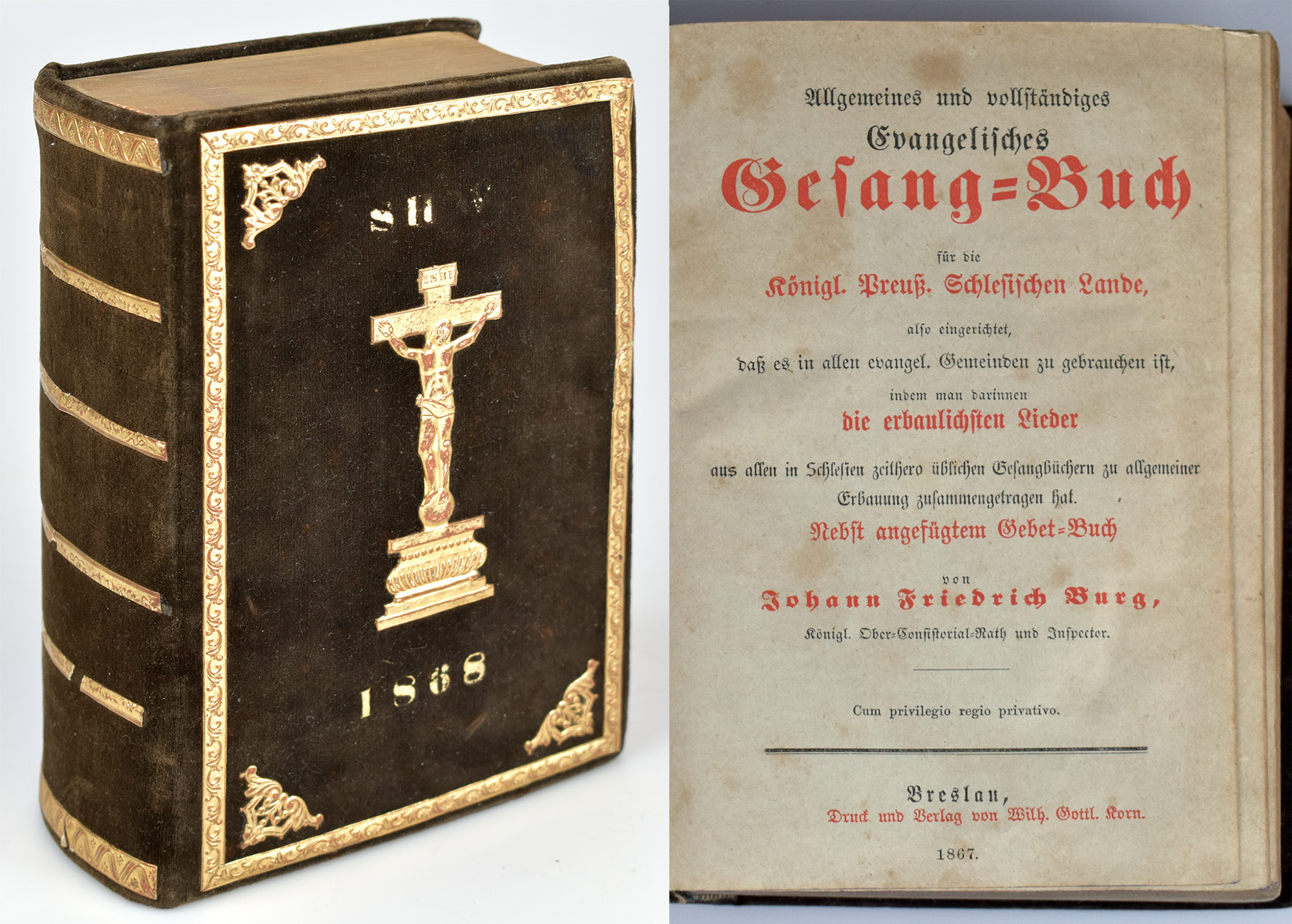 Burg, Johann Friedrich: Allgemeines und vollständiges Evangelisches Gesang-Buch, für die Königl. Preuß. Schlesischen Lande also eingerichtet, daß es in allen evangel. Gemeinden zu gebrauchen ist, indem man darinnen die erbaulichsten Lieder aus allen in Schlesien zeithero üblichen Gesangbüchern zu allgemeinen Erbauung zusammengetragen hat. Breslau, Verlag Wilhelm Gottlieb Korn, 1867. Klein-8°. 17 x 11 cm. IV, 1194, 298 Seiten. Einband mit Samtbezug, rundherum mit goldfarbigen Ornamenten aus Papier, Vorderdeckel mit vergoldetem Christus-am-Kreuz-Motiv und goldgeprägter Jahreszahl. Rundum-Goldschnitt.