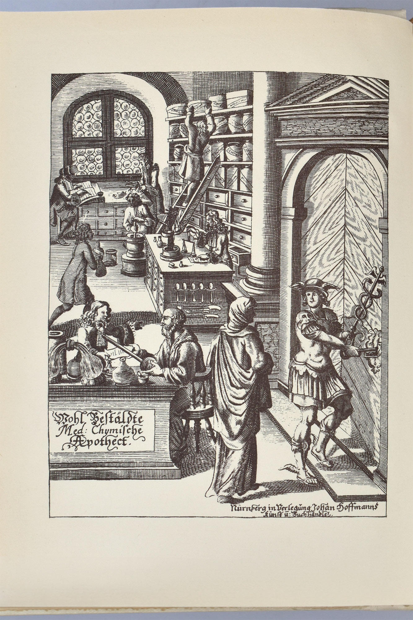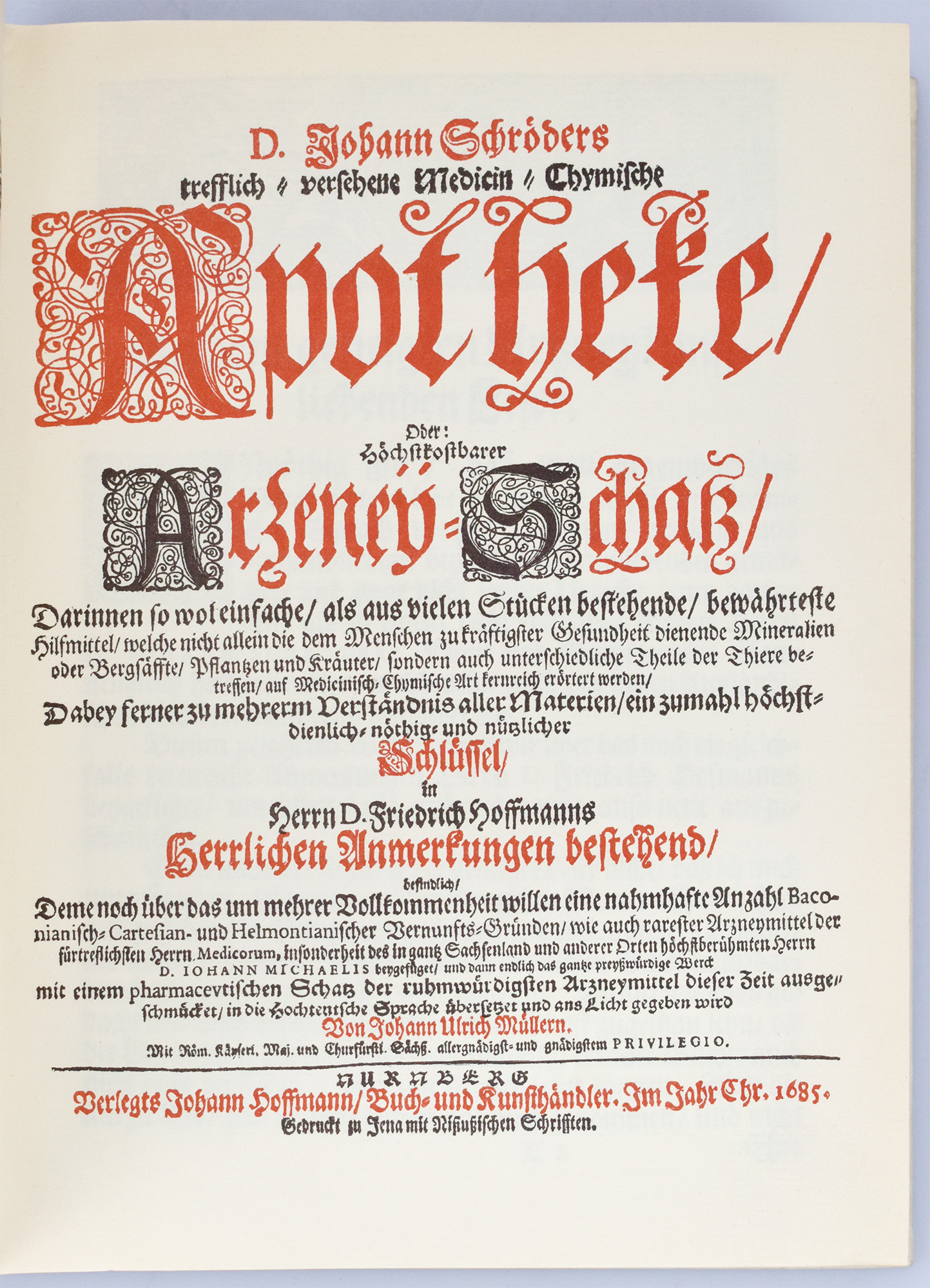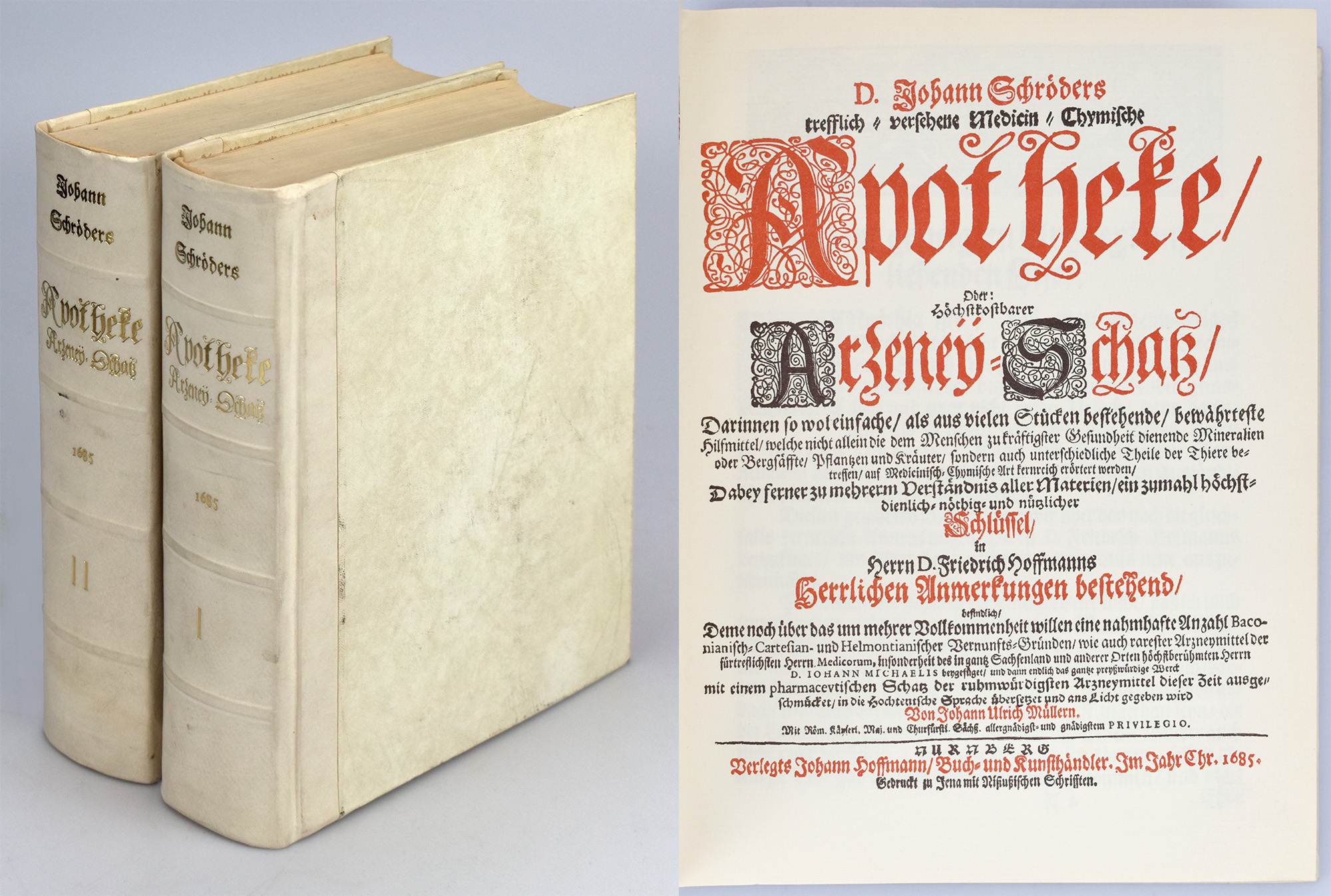 Schröder, Johann: Trefflich versehene medicin-chymische Apotheke oder: Höchstkostbarer Arzeney-Schatz. Darinnen sowohl einfache als aus vielen Stücken bestehende bewährteste Hilfmittel welche nicht allein die dem Menschen zu kräftigster Gesundheit dienende Mineralien oder Pflanzen und Kräuter sondern auch unterschiedliche Theile der Thiere betreffen auf medicinisch-chymische Arterörtert werden. Dabey ferner zu mehrerm Verständnis aller Materien ein zumahl höchstdienlich, nötig und nützlicher Schlüssel im Herrn D. Friedrich Hoffmanns herrlichen Anmerkungen bestehend. 2 Bände. München, Konrad Kölbl Verlag, 1963. Groß-8°. 24,5 x 19 cm. 1526 Seiten, 17 Blatt. Original-Halbpergamentbände mit goldgeprägten Rückentitlen.