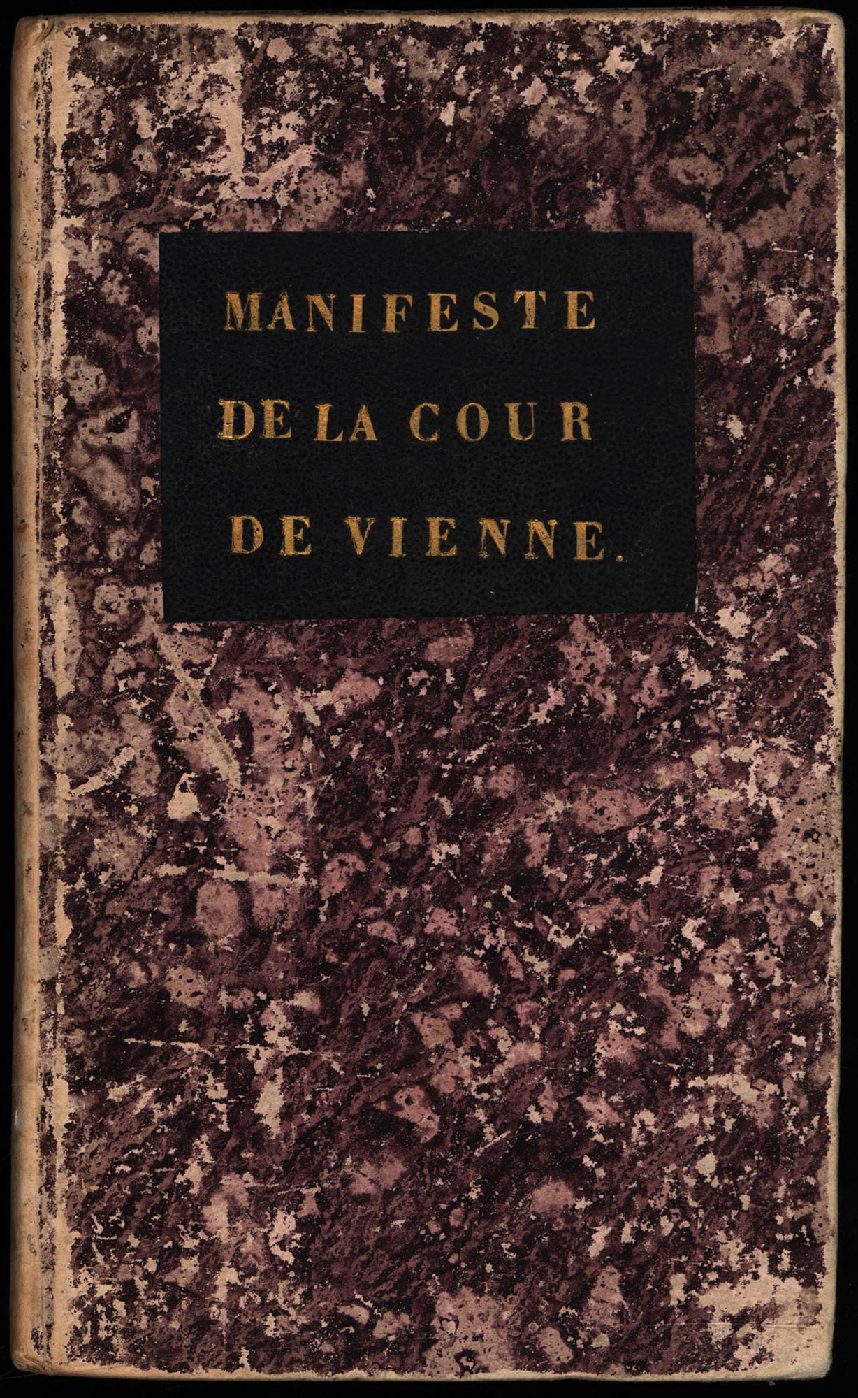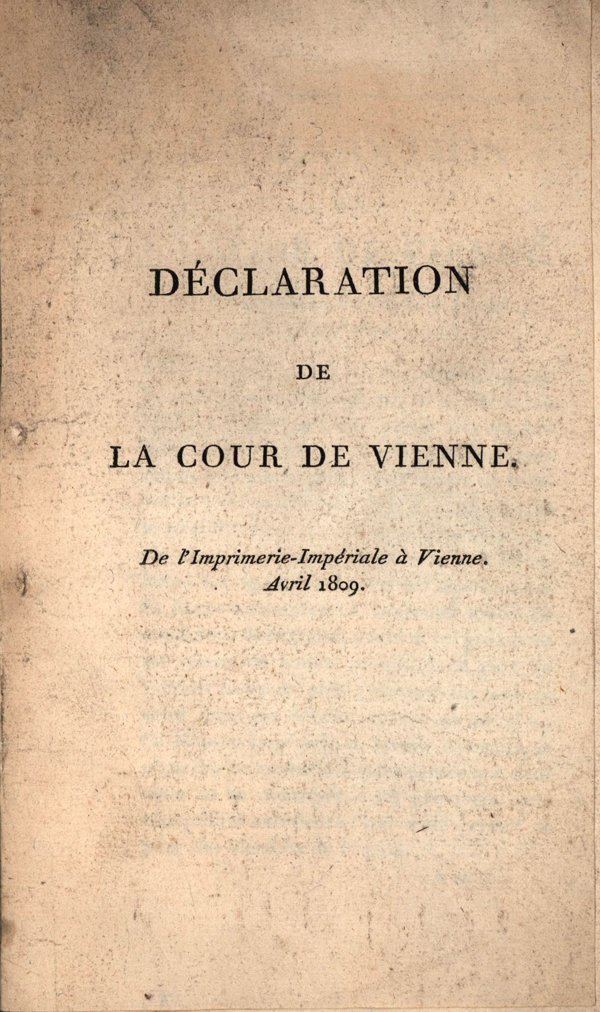 Declaration et manifeste de la cour de Vienne. De l’Imprimerie-Imperiale a Vienne. [Paris], [Agasse], 1809. 8°. 21 x 13 cm. 74 Seiten. Pappband der Zeit mit goldgeprägtem Deckeltitel.