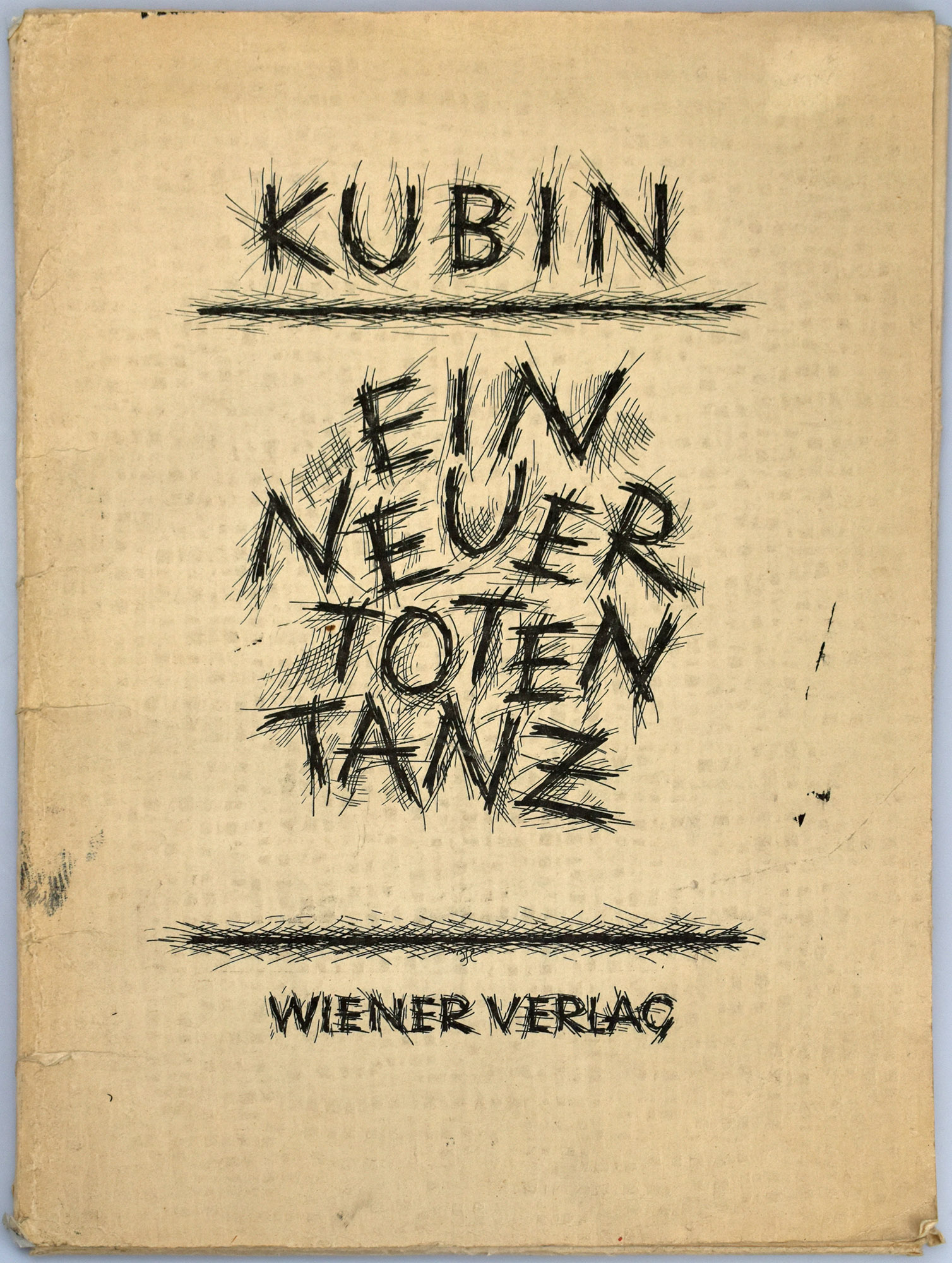 Kubin, Alfred; Wachsmuth, Werner: Ein Neuer Toten Tanz. [Einleitung Werner Wachsmuth]. Wien, Wiener Verlag, 1947. 2°. 42 cm. [10] Seiten. Original-Kartonmappe, 12-seitiger Begleittext, 24 lose Tafeln. First edition. Horodisch 143. Marcks A 29. Printed by Otto v. Holten, Berlin. Title drawing and 22 full-page line etchings after pen and ink drawings, final vignette, cover drawing with lettering by Alfred Kubin. Cover slightly rubbed, slightly stained. Good to very good copy.