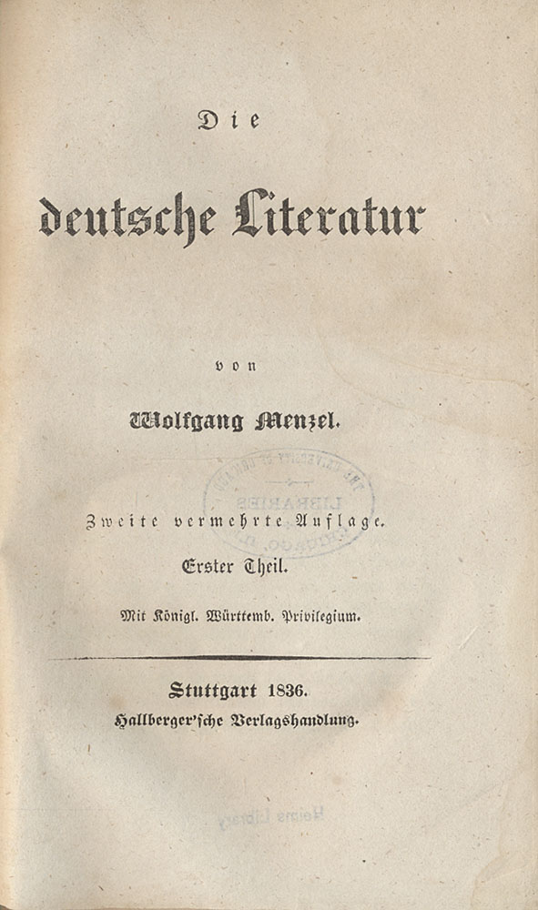 Menzel, Wolfgang: Die deutsche Literatur. 4 Teile [in 2 Bänden, komplett]. Stuttgart, Hallbergersche Verlagsbuchhandlung [Hallberger], 1836. 8°. 21 x 13 cm. 339, 287 Seiten, 1 Blatt; 386 Seiten, 4 Blatt, 408 Seiten. Kaschierte Leinenbände späterer Zeit mit goldgeprägten Titeln auf roten Rückenschildern.