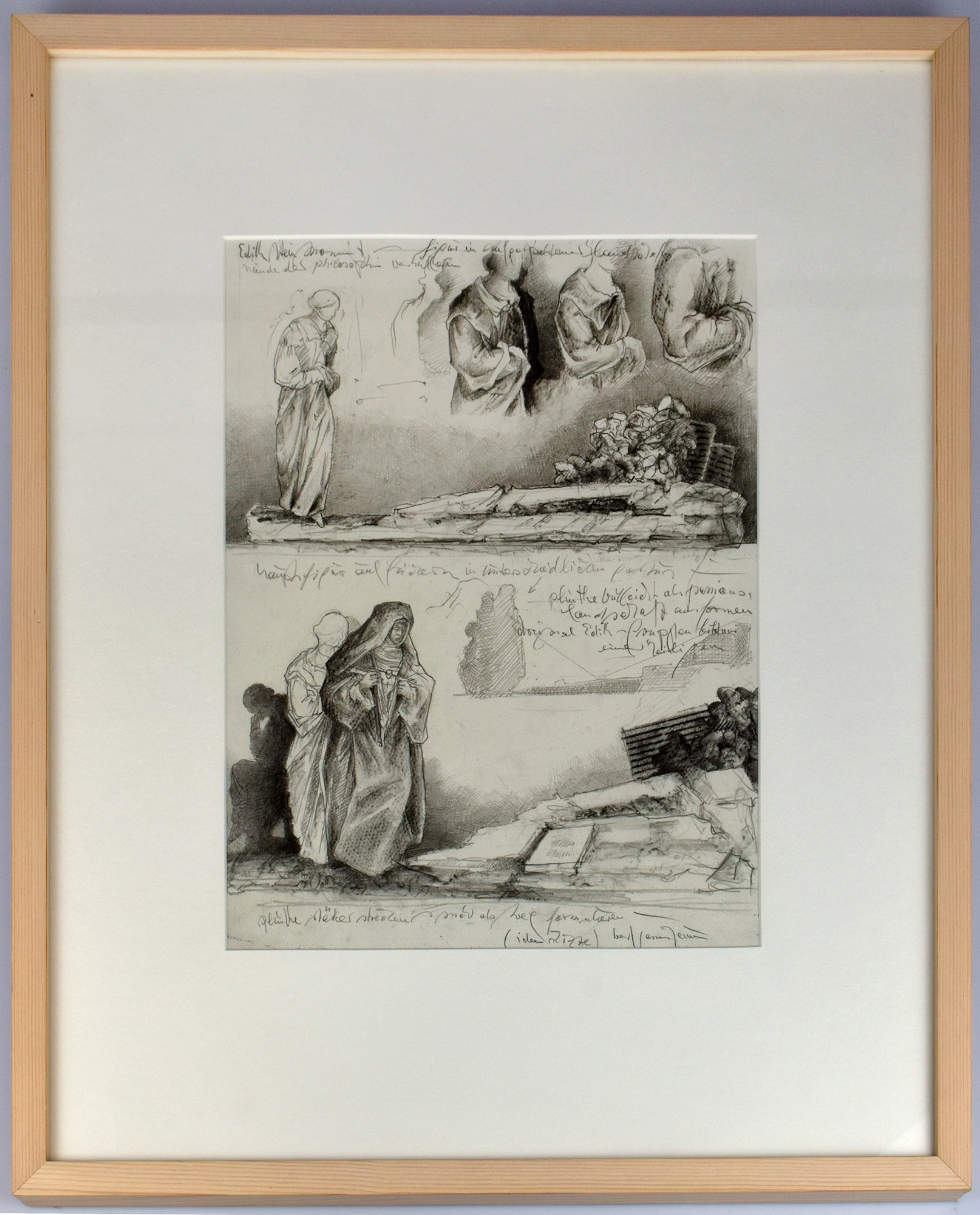 Original pencil drawing on paper. Conceptual sketch for the „Edith Stein Monument“ created around 1997. Engraved in pencil by Bert Gerresheim with descriptive text and signature. Professionally framed behind glass/with a mat in a simple wooden frame. Not examined out of frame. Provenance: From the collection of Wilhelm Blasberg, acquired from him from the 1998 Kevelaer exhibition. Frame dimensions: 52.0 x 42.0 cm. Sheet/image dimensions: 31.8 x 23.5 cm. Very good condition.