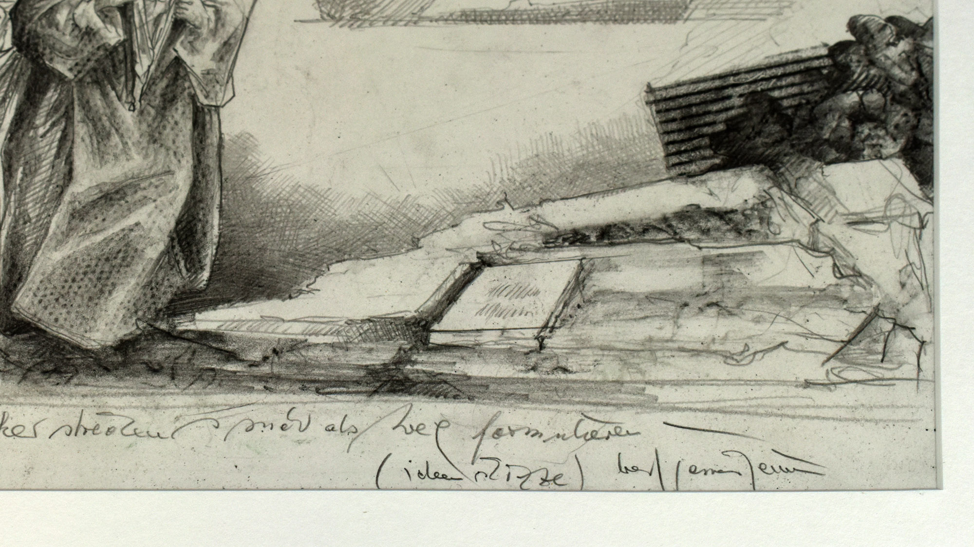Original-Bleistiftzeichnung auf Papier. Ideenskizze zum „Edith-Stein-Monument“ um 1997 entstanden. Von Bert Gerresheim in Blei mit beschreibendem Text und Signatur versehen. Professionell hinter Glas/Passepartout gerahmt im einfachen Holzrahmen. Nicht ausgerahmt. Provenienz: Aus der Sammlung von Wilhelm Blasberg, von diesem aus der Ausstellung Kevelaer 1998 erworben. Maße Rahmen: 52,0 x 42,0 cm. Maße Blatt/Abbildung: 31,8 x 23,5 cm. Sehr guter Zustand.