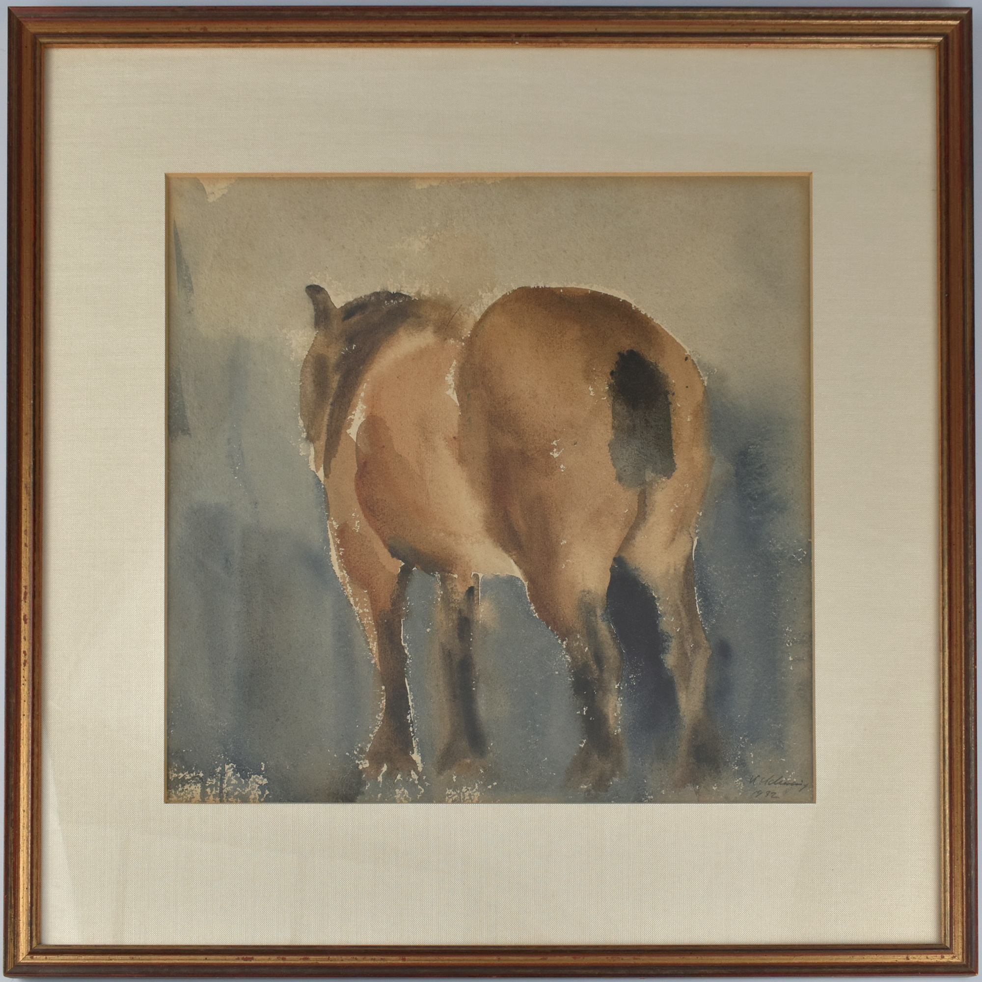 Schwesig, Karl: Braunes Pferd. 1932. [Signiertes Aquarell, gerahmt / signed watercolor, framed]. (Karl Schwesig, geboren am 19. Juni 1898 in Braubauerschaft, gestorben am 19. Juni 1955 in Düsseldorf. Deutscher Maler, Mitglied der Künstlervereinigung „Das Junge Rheinland“, „Rheinische Sezession“, gehörte zum Kreis um Johanna Ey. 1918 bis 1920 besuchte Schwesig die Kunstakademie Düsseldorf. Im Faschismus verfolgt, als entarteter Künstler diffamiert).