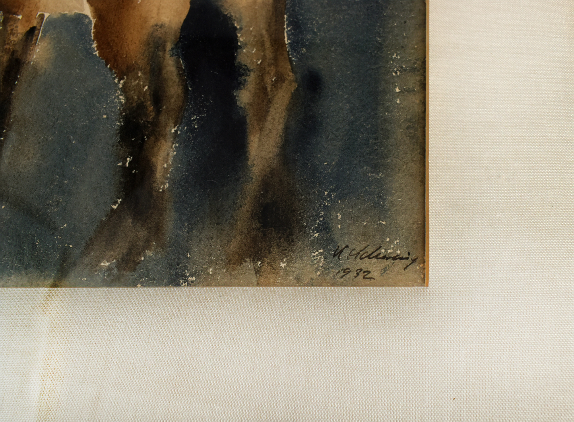 Watercolor on laid paper. Signed and dated (1932) in black by Karl Schwesig within the image, lower right. Framed behind glass/mounted in a partially gilded wooden frame. Not examined out of frame. Provenance: From the Wilhelm Blasberg Collection. Frame dimensions: 44.0 x 44.0 cm. Image dimensions: 30.0 x 30.0 cm. Several labels on the verso from exhibitions where the painting was shown. Very good condition.
