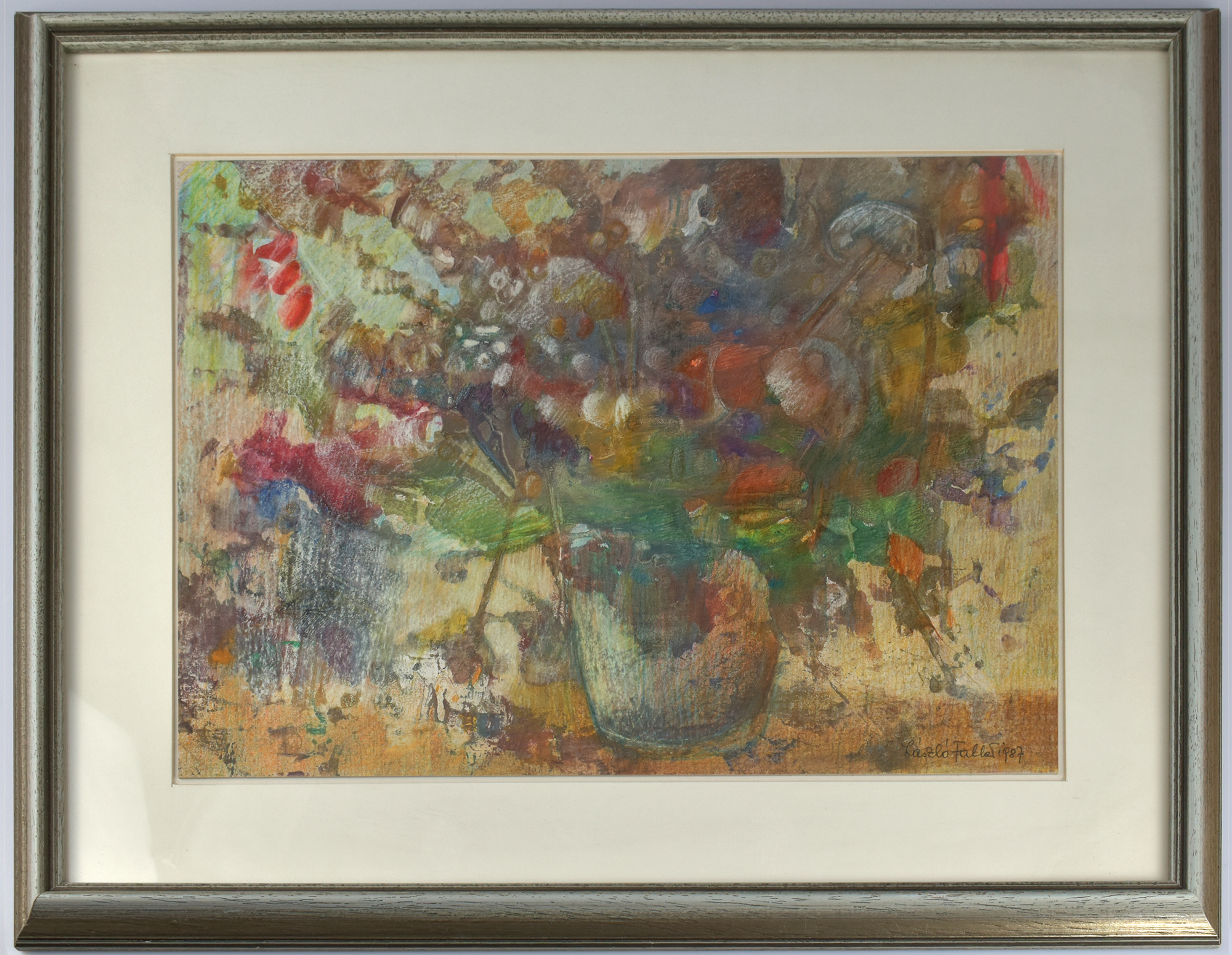 Faller, Laszlo: Blumenstillleben. [19]87. [Gouache auf Karton, gerahmt / gouache on cardbord, framed]. (László Faller, geboren 1930 in Söpte bei Szombathely/Ungarn, gestorben 1996 in Düsseldorf. Studium an der Kunstakademie in Budapest und Düsseldorf).