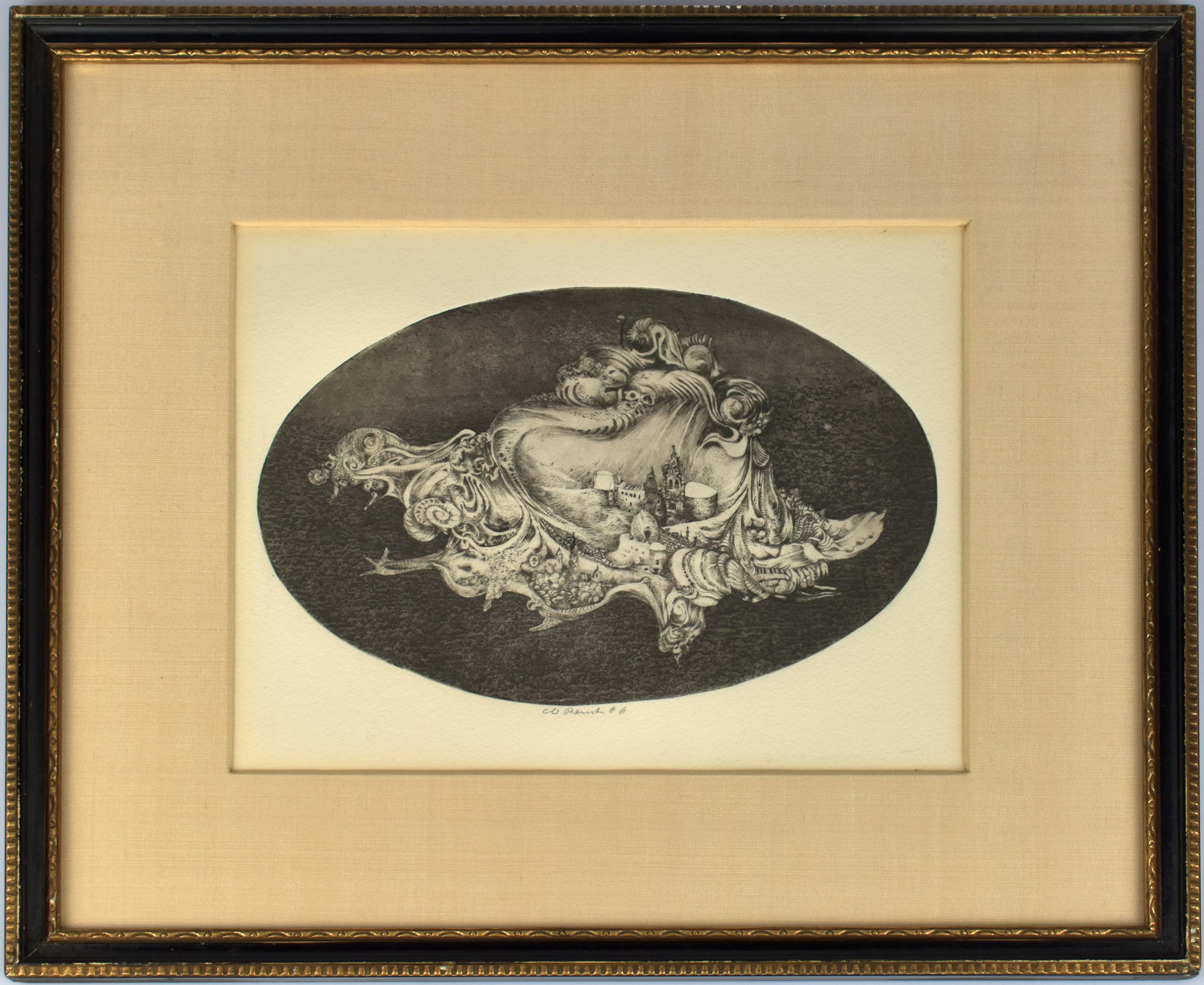 Original etching, drypoint with aquatint on copperplate laid paper. One of 50 copies, unnumbered here. Signed and dated (66) in lead by Caspar Walter Rauh below the image. Catalogue raisonné Küfner 115. Framed behind glass/mounted in a partially gilded wooden frame. Frame dimensions: 27.0 x 31.5 cm. Image dimensions: 12 x 18 cm. Very good condition.