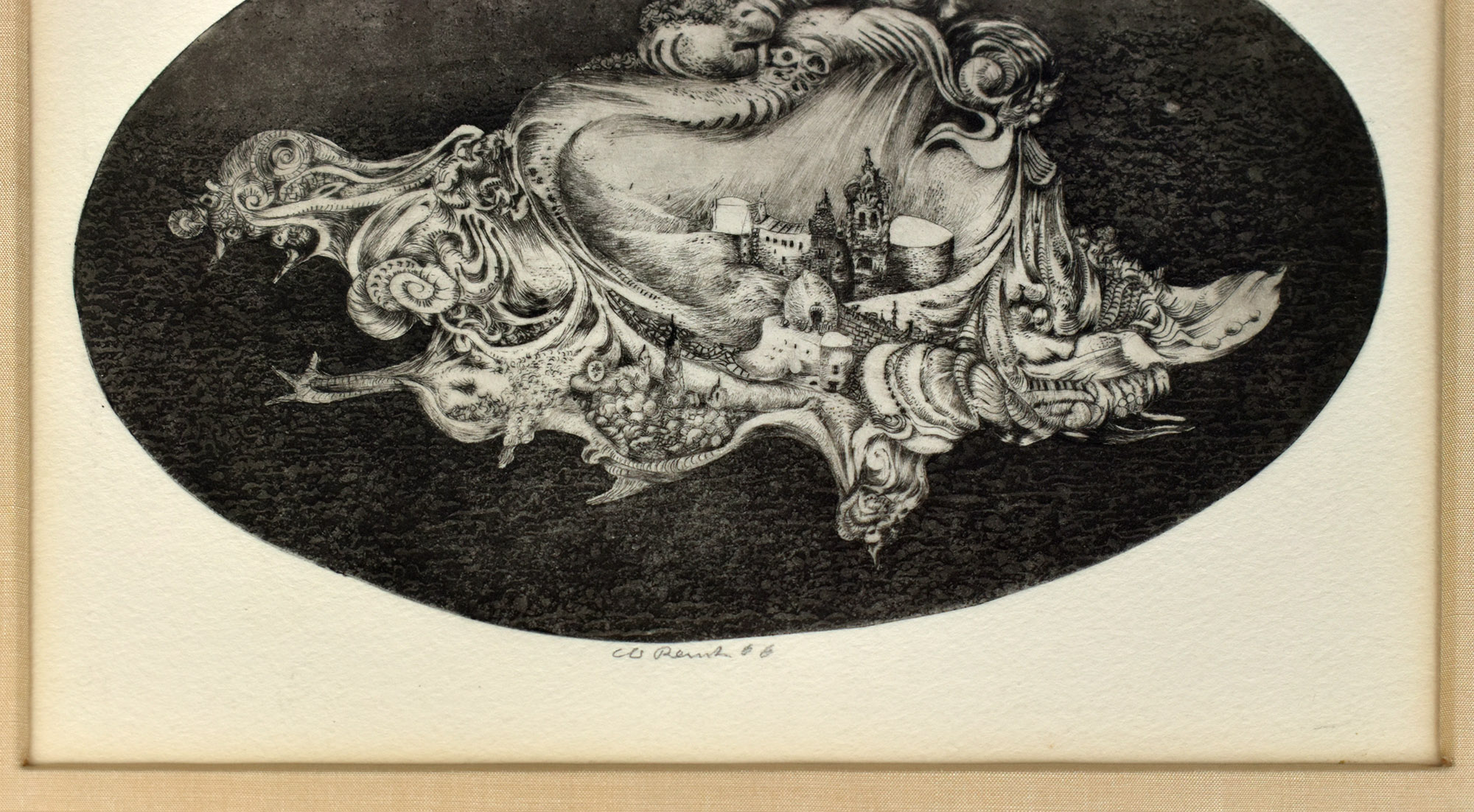 Rauh, Caspar Walter: Intime Mitteilung. [19]66. [Signierte Original-Radierung, gerahmt / signed original etching, framed]. (Caspar Walter Rauh, geboren am 13. Oktober 1912 in Würzburg, gestorben am 7. Oktober 1983 in Kulmbach. Deutscher Zeichner, Grafiker und Maler, Vertreter des Phantastischen Realismus. Studium ab 1932 an der Kunstakademie Düsseldorf bei Werner Heuser und Heinrich Nauen. 1934/35 verbrachte er einige Monate in Amsterdam im Kreis ehemaliger Paul Klee- und Bauhaus-Schüler, ab 1936 setzte er sein Kunststudium an der Akademie Leipzig bei Walter Tiemann fort.