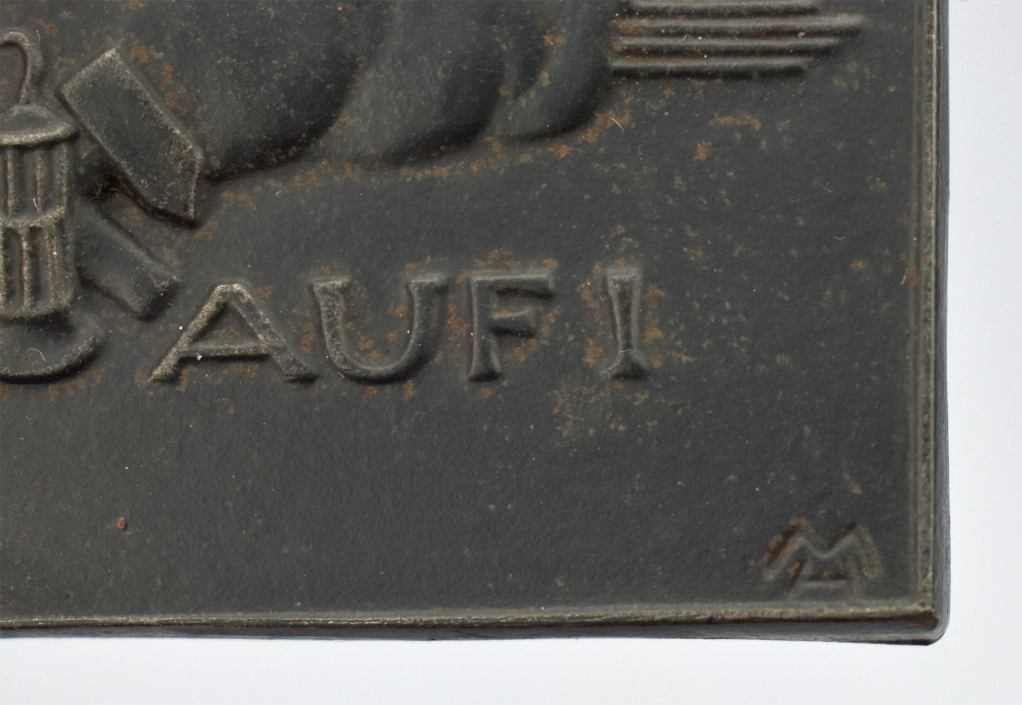 Blackened cast iron relief, published by the Lauchhammer art foundry in 1933. Plaque with text, lower left, Lauchhammer foundry stamp, monogrammed „HM“ lower right, and a hanging loop on the reverse. Dimensions: 14.5 x 8.8 cm. Weight: 232 g. Very good copy.