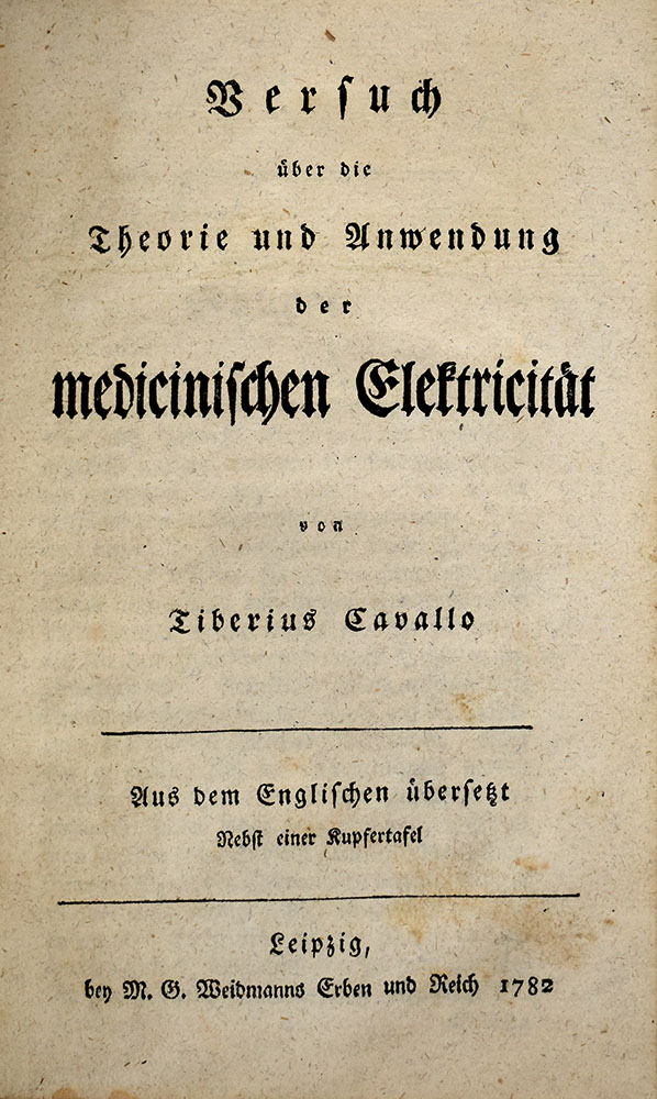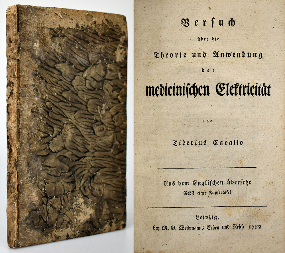 Cavallo, Tiberius: Versuch über die Theorie und Anwendung der medicinischen Elektricität. Aus dem Englischen übersetzt. Leipzig, Verlag Weidmanns Erben und Reich, 1782. Klein-8°. 20,5 x 12,5 cm. VI, 84 Seiten. Pappband der Zeit mit rotem Sprengschnitt.