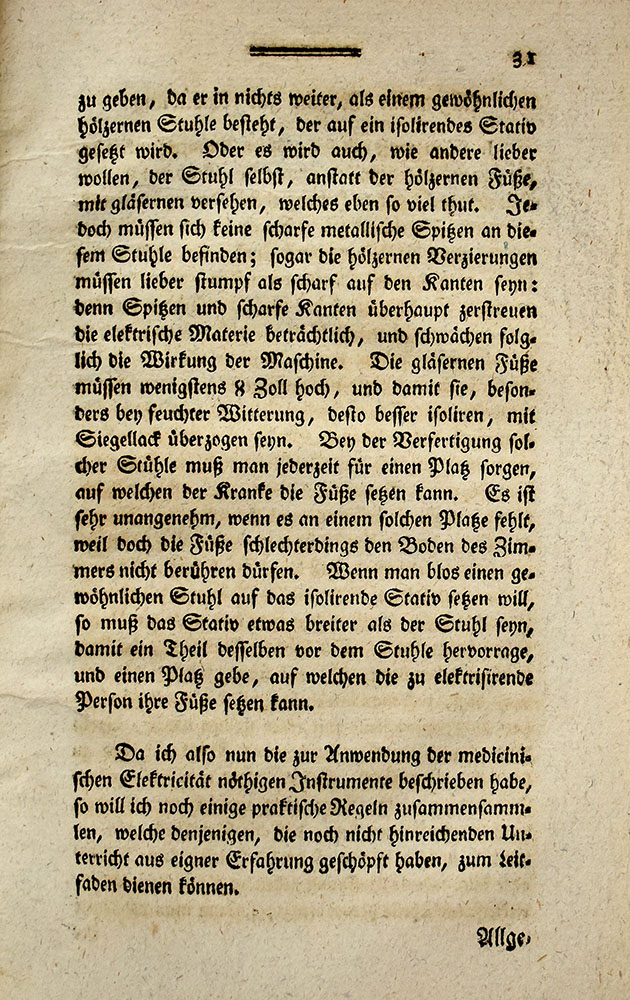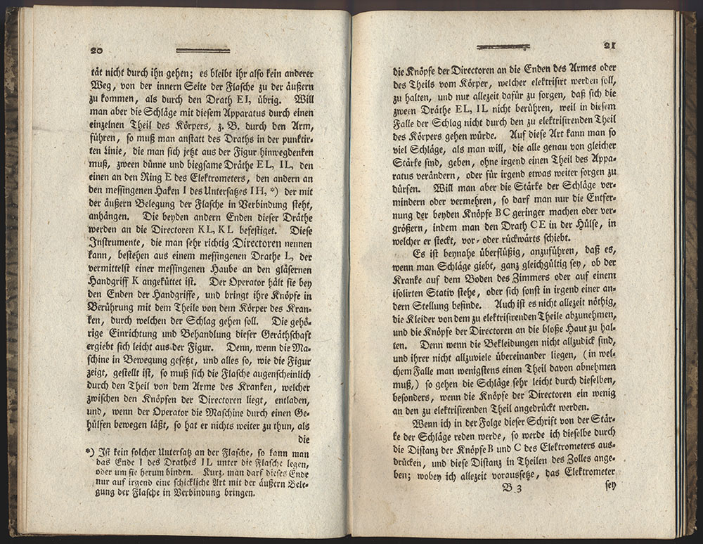 Erste deutsche Ausgabe. Ersch (NA) III, 209, 2110a. VD18 13980920 (hier fälschlich Erscheinungsdatum mit 1782 angegeben). Die englische Originalausgabe war 1780 unter dem Titel „An Essay on the theory and practice of medical electricity“ publiziert worden. Ursprünglich 1771 mit kaufmännischen Absichten nach London gekommen, widmete sich der innovative, neapolitanische Amateurphysiker bald gänzlich der naturwissenschaftlichen Forschung und trug maßgeblich zum Erkenntnisgewinn unter anderem in den Bereichen der Elektrizität (beispielsweise durch seine Arbeit zum Elektroskop und Elektrometer) und der Pneumatik (durch Instrumente zur Gasanalyse, Luftpumpen, aber auch wegbereitende Versuche zur Ballonfahrt unter anderem mittels wasserstoffgefüllter Seifenblasen) bei. Die im vorliegenden Band angestellten Überlegungen zur medizinischen Verwendung von Elektrizität wurden vielfach, unter anderem auch durch Lichtenberg in seinen Vorlesungen zur Naturlehre, zitiert und bildeten einen Grundstein weiterführender Forschung. Einband stark beschabt, Ecken bestoßen, Rücken mit kleiner Fehlstelle am oberen Kapital, Kupfertafel fehlend, Vorsätze stock- bzw. tintenfleckig, ansonsten gutes Exemplar.