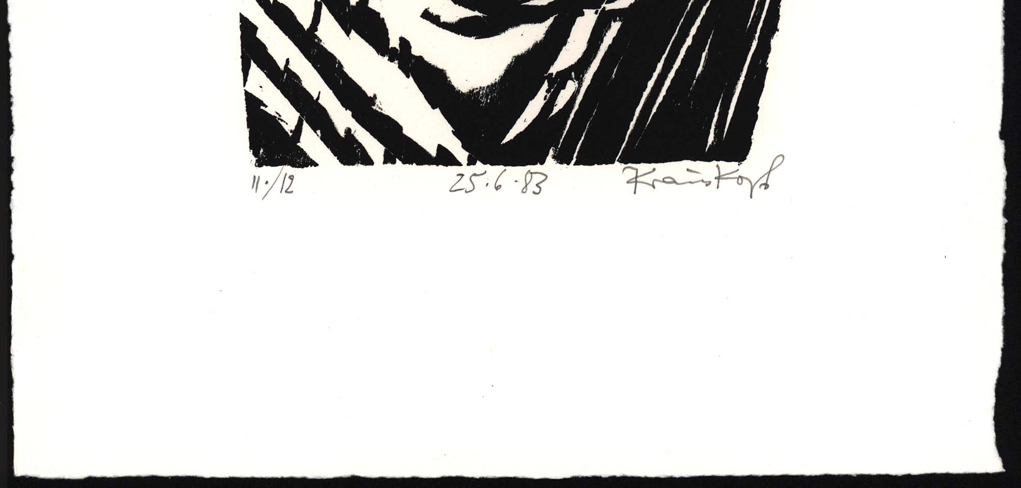 Number 11 of 12 numbered original woodcuts on laid paper. Signed and dated (June 25, 1983) in lead by Karl Heinz Krauskopf below the image. Provenance: From the Wilhelm Blasberg Collection. Sheet dimensions: 38.0 x 27.0 cm. Image dimensions: 23.4 x 15.0 cm. Very good condition.