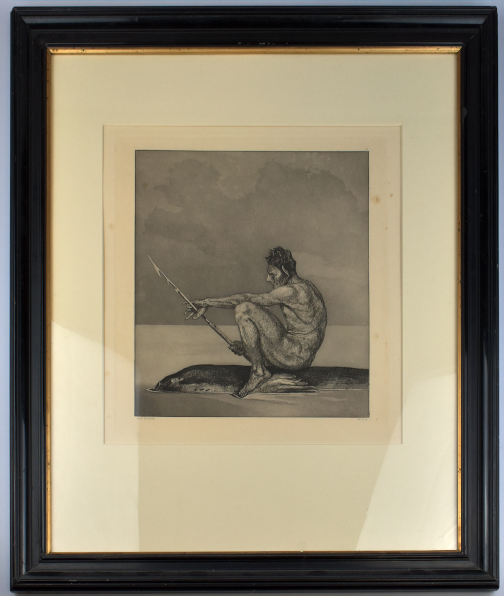 Original-Radierung, Aquatinta auf cremefarbenem Englischen Kupferdruckpapier. Blatt IV aus dem Portfolio „Eva und die Zukunft“, 4. Auflage herausgegeben von Wilhelm Felsing, München 1898. Radierung mit der Nummer „IV“, Name „Max Klinger“ sowie „Opus III“ versehen. Werkverzeichnis Singer 46, VI. Hinter Glas/Passepartout gerahmt im teils vergoldeten, alten , schwarzen Holzrahmen. Nicht ausgerahmt. Maße Rahmen: 56,5 x 47,5 cm. Maße Abbildung: 26,4 x 22,8 cm. Blatt im Randbereich leicht stockfleckig, Rahmen mit leichten Gebrauchsspuren. Gutes bis sehr gutes Exemplar.