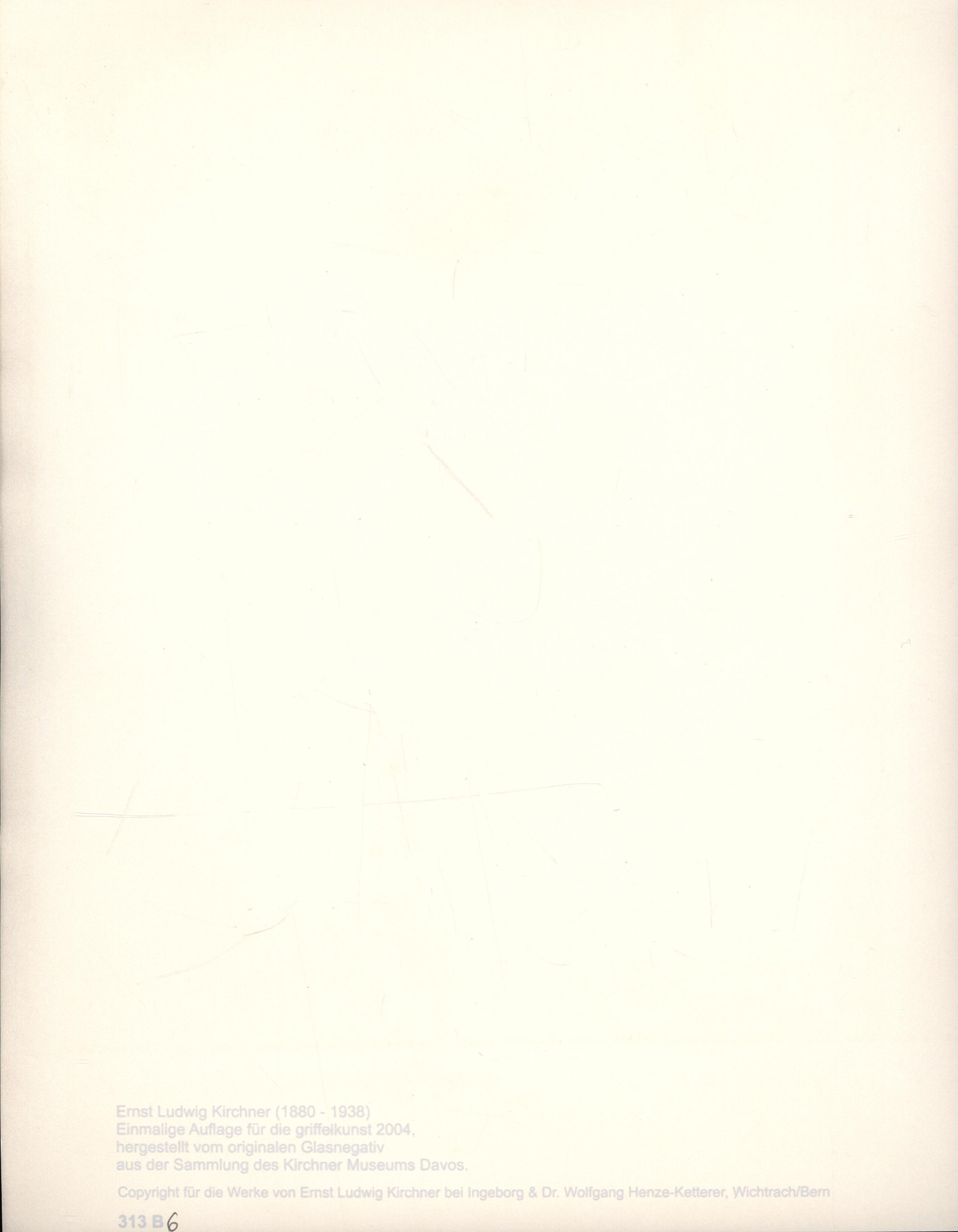6 Original-Fotografien in Schwarz-Weiß. Hergestellt von den Original-Glasnegativen aus der Sammlung des Kirchner Museums Davos. Einmalige Auflage für die Griffelkunst Hamburg, 2004. Rückseitig mit typografischer Beschriftung versehen. Serie in einer Mappe mit 8-seitigem begleitenden Text von Günther Gercken. Griffelkunst, Verzeichnis der Editionen 313 B1-B6. Maße Blätter: 30,5 x 24,0 cm. Maße Abbildung: 24,0 x 18,0 cm. Die txtilschließen der Mappe wurden entfernt. Fotografien in sehr gutem, tadellosem Zustand.
