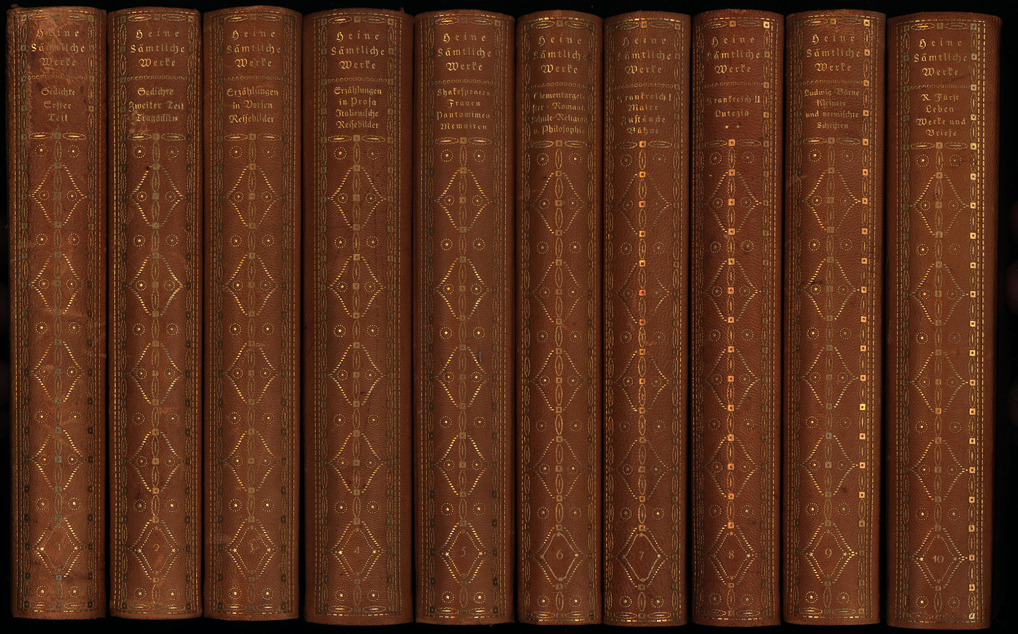 Heine, Heinrich: Heines sämtliche Werke. Band 1: Das Buch der Lieder. Neue Gedichte. Historien. Lamentationen. Band 2: Hebräische Melodien. Poetische Nachlese. Tragödien. Band 3: Erzählungen in Versen. Reisebilder. Band 4: Erzählungen in Prosa. Italienische Reisebilder. Band 5: Shakespeares Mädchen und Frauen. Pantomimen. Memoiren. Band 6: Elementargeister. Die Romantische Schule. Religion und Philosophie in Deutschland. Band 7: Frankreich I. Französische Maler. Französische Zustände. Über die französische Bühne. Band 8: Frankreich II. Lutezia. Band 9: Ludwig Börne. Kleinere und vermischte Schriften. Testamente. Band 10: Leben, Werke und Briefe von Rudolf Fürst. 10 Bände (komplett). Leipzig, Tempel-Verlag, um 1910. 8°. 21 x 13 cm. 497, 461 (1), 509, 559, 485, 429, 419, 421, 490, 539 Seiten. Original-Halblederbände mit goldgeprägten Rückentiteln und Kopfgoldschnitten. (Tempel-Klassiker).