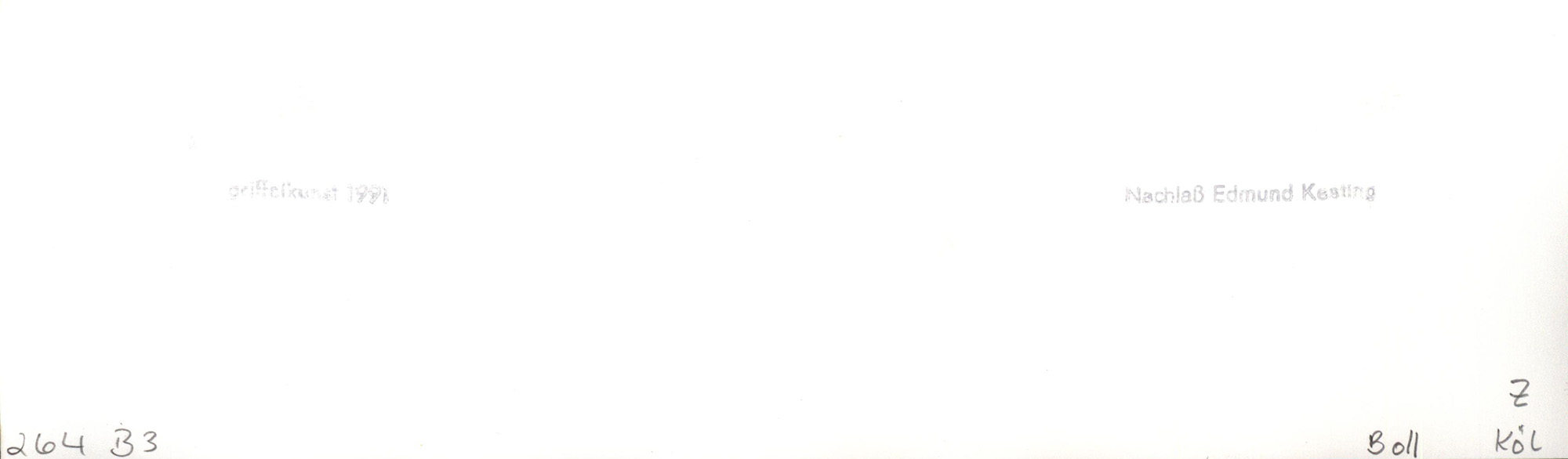 Originalfotografie in Schwarz-Weiß aus dem Nachlass. Fotomontage. Silbergelatineabzug auf Agfa-Fotopapier. Herausgegeben von der Griffelkunst-Vereinigung Hamburg, 1991. Griffelkunst, Verzeichnis der Editionen 264 B3. Maße Blatt: 40,2 x 30,5 cm. Maße Abbildung: 31,7 x 22,5 cm. Rückseitig mit typografischer Beschriftung:“ Nachlaß Edmund Kesting“. Am oberen Rand vorderseitig zwei Streifen transparenten Klebebandes aus ehemaliger Montage im Rahmen. Ansonsten noch sehr gutes Exemplar.