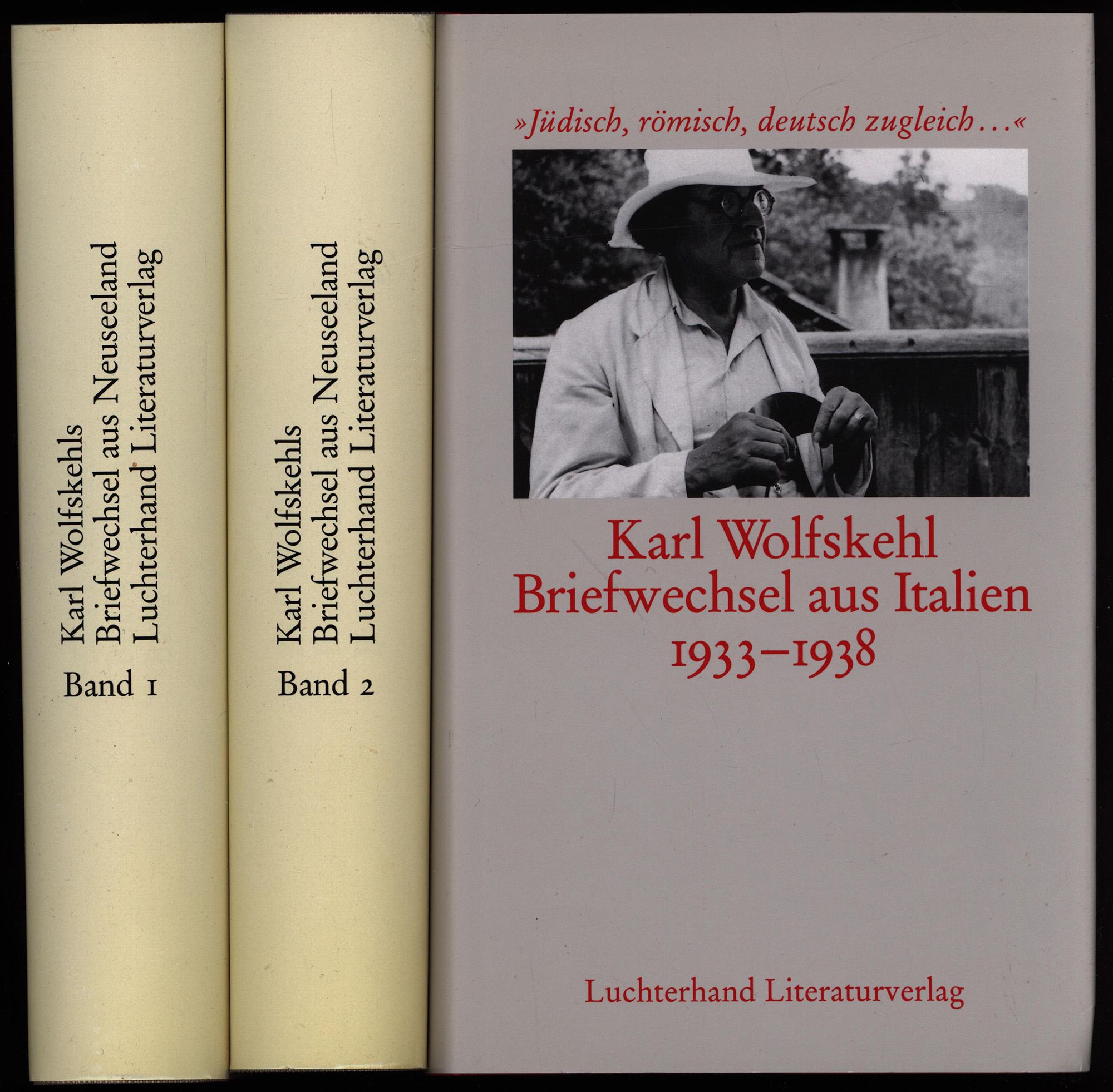 Wolfskehl, Karl: Karl Wolfskehls Briefwechsel aus Neuseeland 1938 – 1948. Band 1 und 2. Mit einem Vorwort von Paul Hoffmann herausgegeben von Cornelia Blasberg. Band 3: Karl Wolfskehl: Briefwechsel aus Italien 1933 – 1938. Herausgegeben und kommentiert von Cornelia Blasberg. 3 Bände. Darmstadt, Luchterhand-Literaturverlag, 1988-1993. 8°. 24 x 15 cm. 672 Seiten, 673-1333, 469 Seiten. Original-Leinenbände mit Original-Schutzumschlägen. (= Veröffentlichungen der Deutschen Akademie für Sprache und Dichtung Darmstadt, 61. und 68. Veröffentlichung).