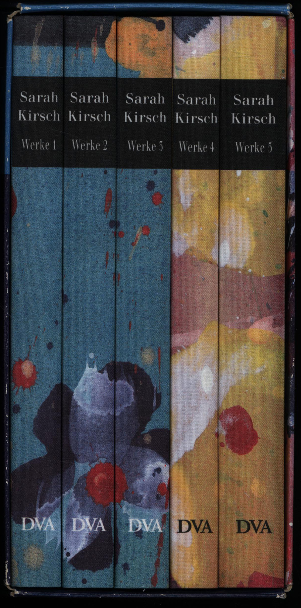 Kirsch, Sarah – Hackel, Franz-Heinrich [Hrsg.]: Werke in fünf Bänden. Erster Band: Gedichte 1. Zweiter Band: Gedichte 2. Dritter Band: Gedichte 3. Vierter Band: Prosa 1. Fünfter Band: Prosa 2. 5 Bände (komplett). [Signiertes Exemplar]. Stuttgart, Deutsche Verlags-Anstalt, 1999. 8°. 19,5 x 13 cm. 205, 305, 223, 229, 237 Seiten. Original-Halbleinenbände in illustriertem Pappschuber.