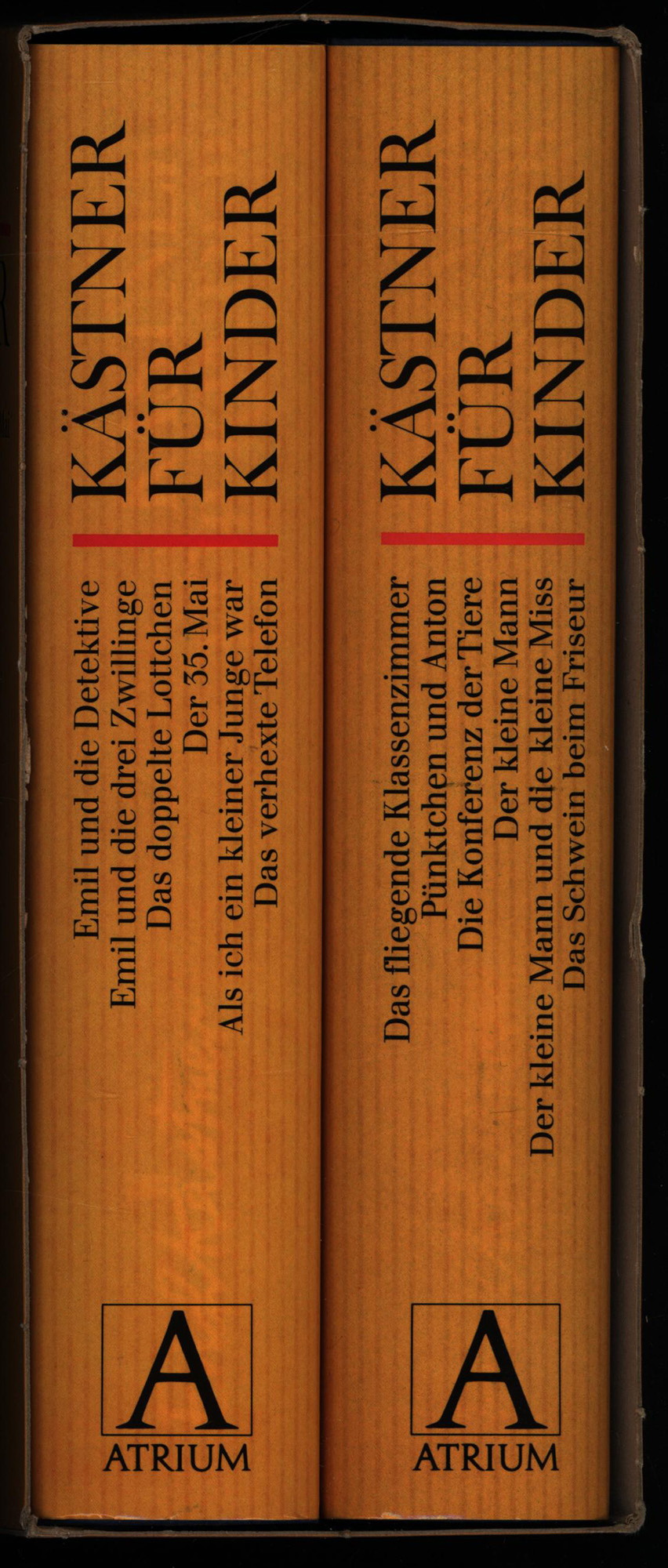 Kästner, Erich: Kästner für Kinder. 2 Bände (komplett). Zürich, Atrium-Verlag, 1985. 8°. 21 x 13 cm. 669 (1) und 669 (2) Seiten. Original-Pappbände mit Original-Schutzumschlägen im illustrierten Original-Pappschuber.