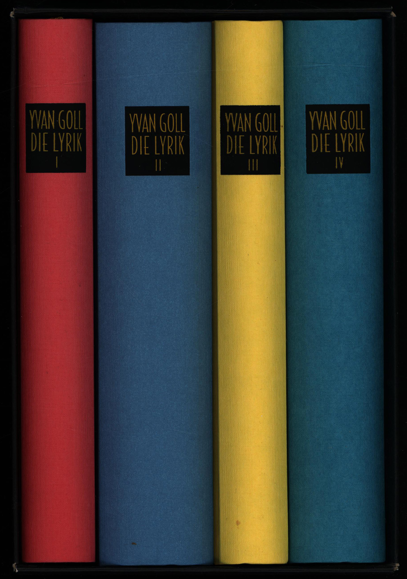Goll, Yvan – Glauert-Hesse, Barbara [Hrsg.]: Die Lyrik in vier Bänden. Band 1: Frühe Gedichte 1906-1930. Band 2: Liebesgedichte 1917-1950. Band 3: Jean Sans Terre / Johann Ohneland. Band 4: Späte Gedichte 1930-1950. Herausgegeben und kommentiert von Barbara Glauert-Hesse im Auftrag der Fondation Yvan et Claire Golol Sain-Dié-des-Vosges. 4 Bände (komplett). Berlin, Argon, 1996. 8°. 20 x 13 cm. 414, 660, 208, 564 Seiten. Gebundene Original-Pappbände im Original-Pappschuber.