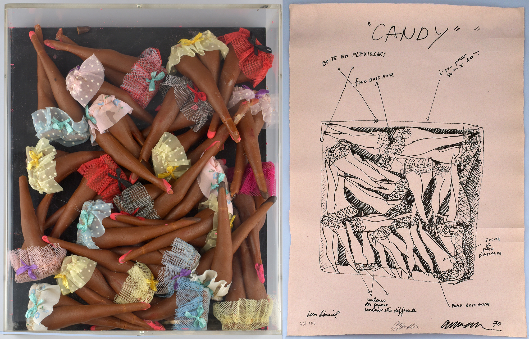 Number 73 of 100 multiples, an accumulation of marzipan doll legs in polyester tutus, on a black wooden panel in a Plexiglas box. With an enclosed lithograph with a sketch of the object and description. Numbered and signed by Arman in black below the image. The multiple was published in 1970 by the Eat Art Gallery, Daniel Spoerri, in Düsseldorf. The lithograph was printed by Carlo Schröter. Object dimensions: 33 x 27 x 8 cm. Lithograph dimensions: 62.5 x 44.0 cm. Lithograph with slight creases. Multiple in very good condition.