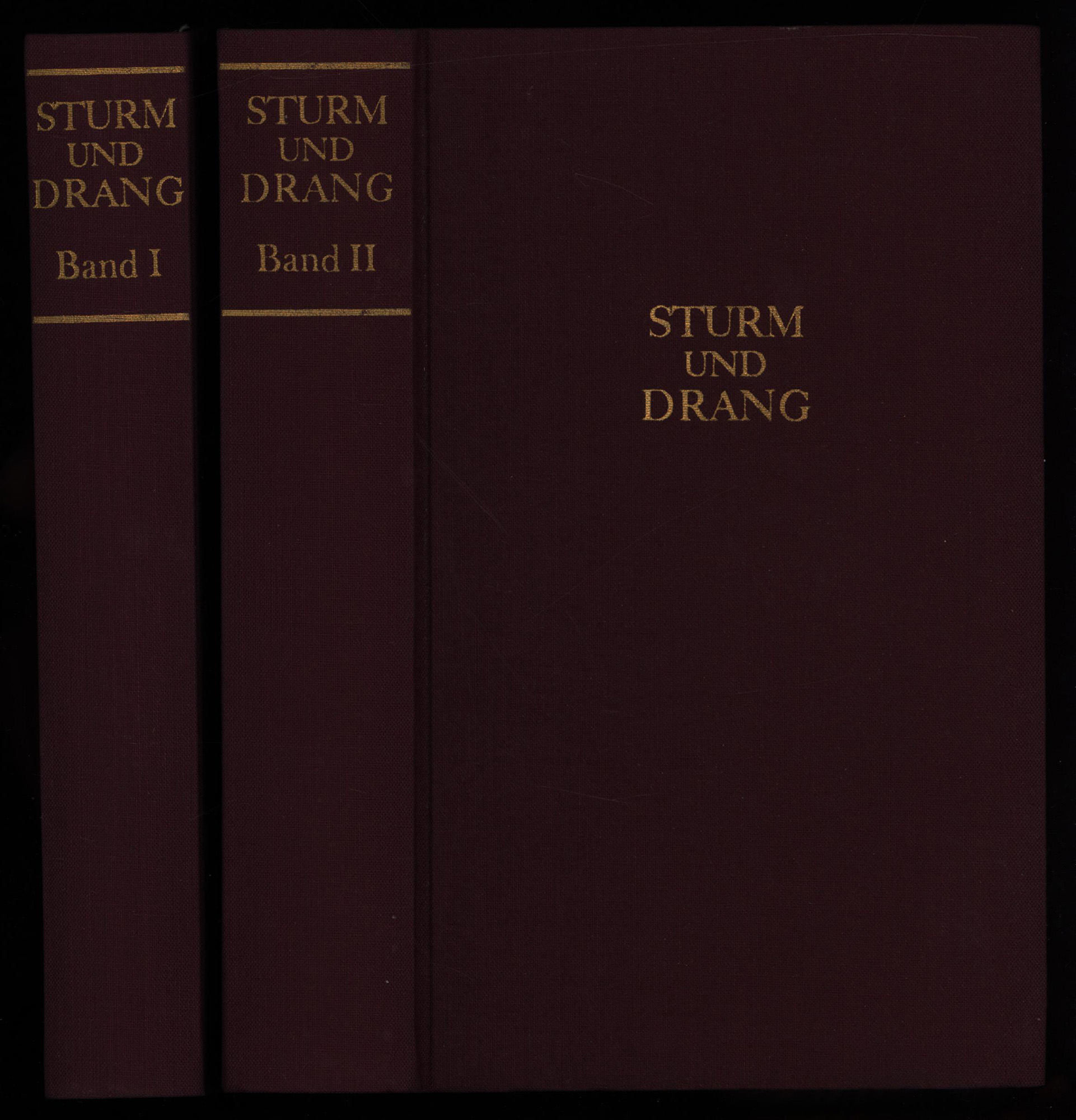 Nicolai, Heinz [Hrsg.]: Sturm und Drang. Dichtungen und theoretische Texte in zwei Bänden. Band 1 und 2. 2 Bände (komplett). Darmstadt, Wissenschaftliche Buchgesellschaft, 1971. 8°. 19,5 x 12 cm. 1975 Seiten. Original-Leinenbände mit goldgeprägten Deckel- und Rückentiteln.