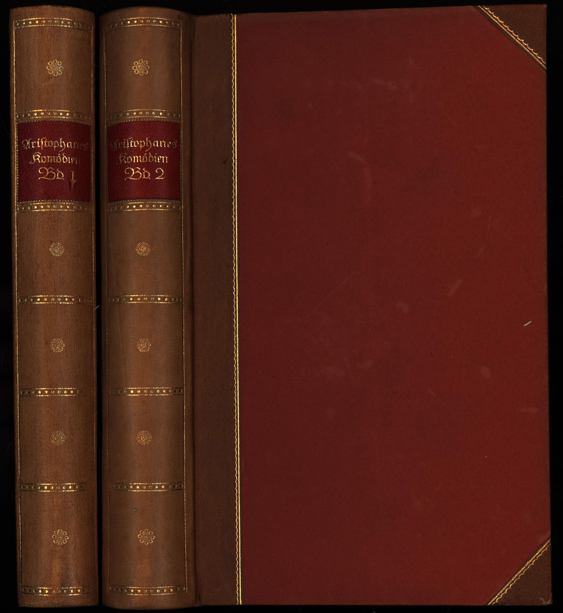 Aristophanes: Aristophanes. Komödien. Deutsch von Ludwig Seeger. Neu herausgegeben, eingeleitet und mit Anmerkungen versehen von Thassilo von Scheffer. 2 Bände (komplett). München und Leipzig, Georg Müller, 1913. 8°. 22 x 14 cm. 429, 509 Seiten. Original-Halblederbände mit goldgeprägten Rückentiteln und roten Farbschnitten. (= Klassiker des Altertums. II. Reihe. Band 7 und 8).