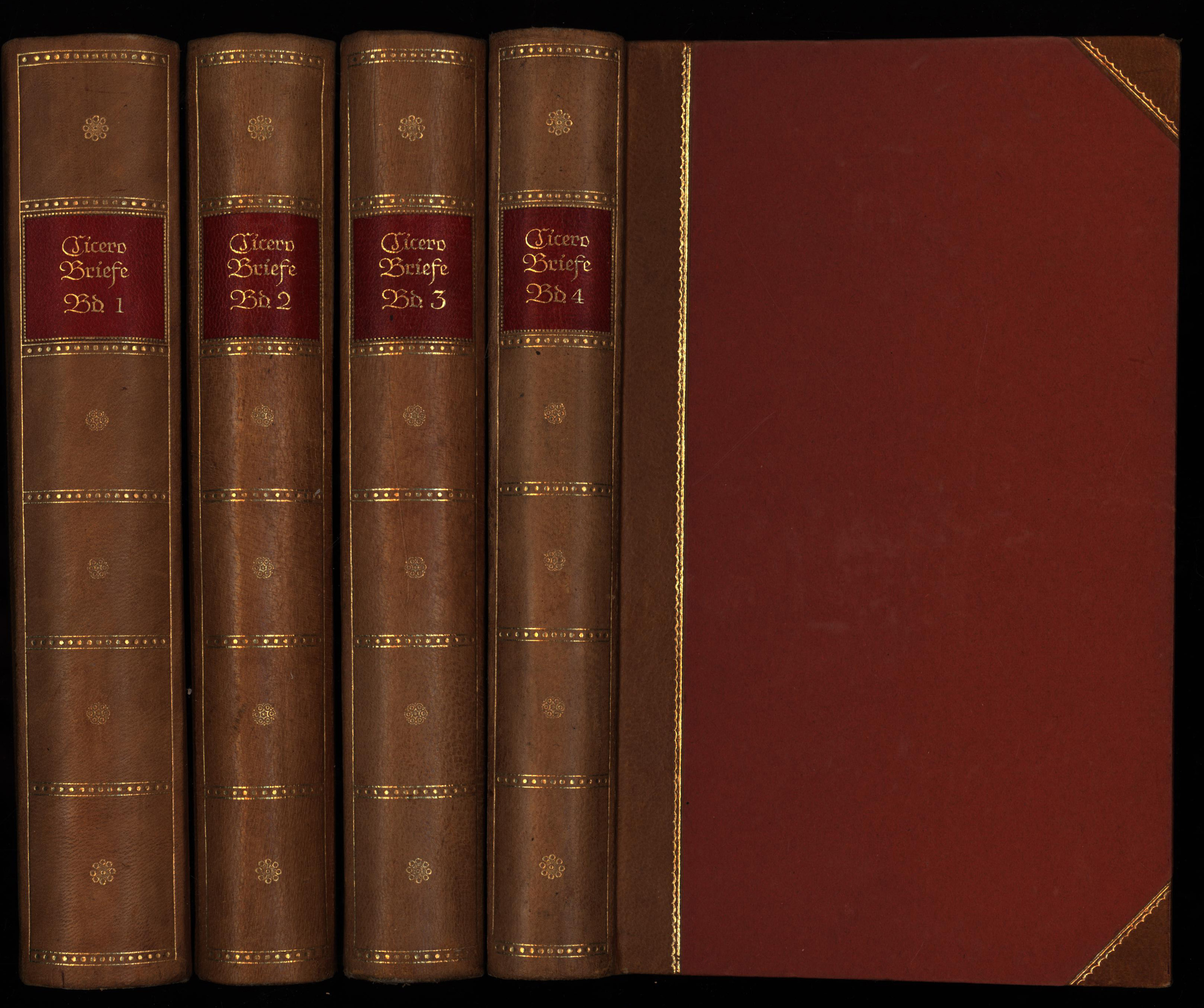 Cicero, Marcus Tullius: Cicero. Briefe. Nach der Übersetzung von C. M. Wieland neu herausgegeben. 4 Bände (komplett). München und Leipzig, Georg Müller Verlag, 1912-1913. 8°. 22 x 14 cm. 552, 495, 502, 431 Seiten. Original-Halblederbände mit goldgeprägten Rückentiteln und roten Farbschnitten. (= Klassiker des Altertums. Erste Reihe. Ausgewählt und herausgegeben von Heinrich Conrad. Band 17-20).