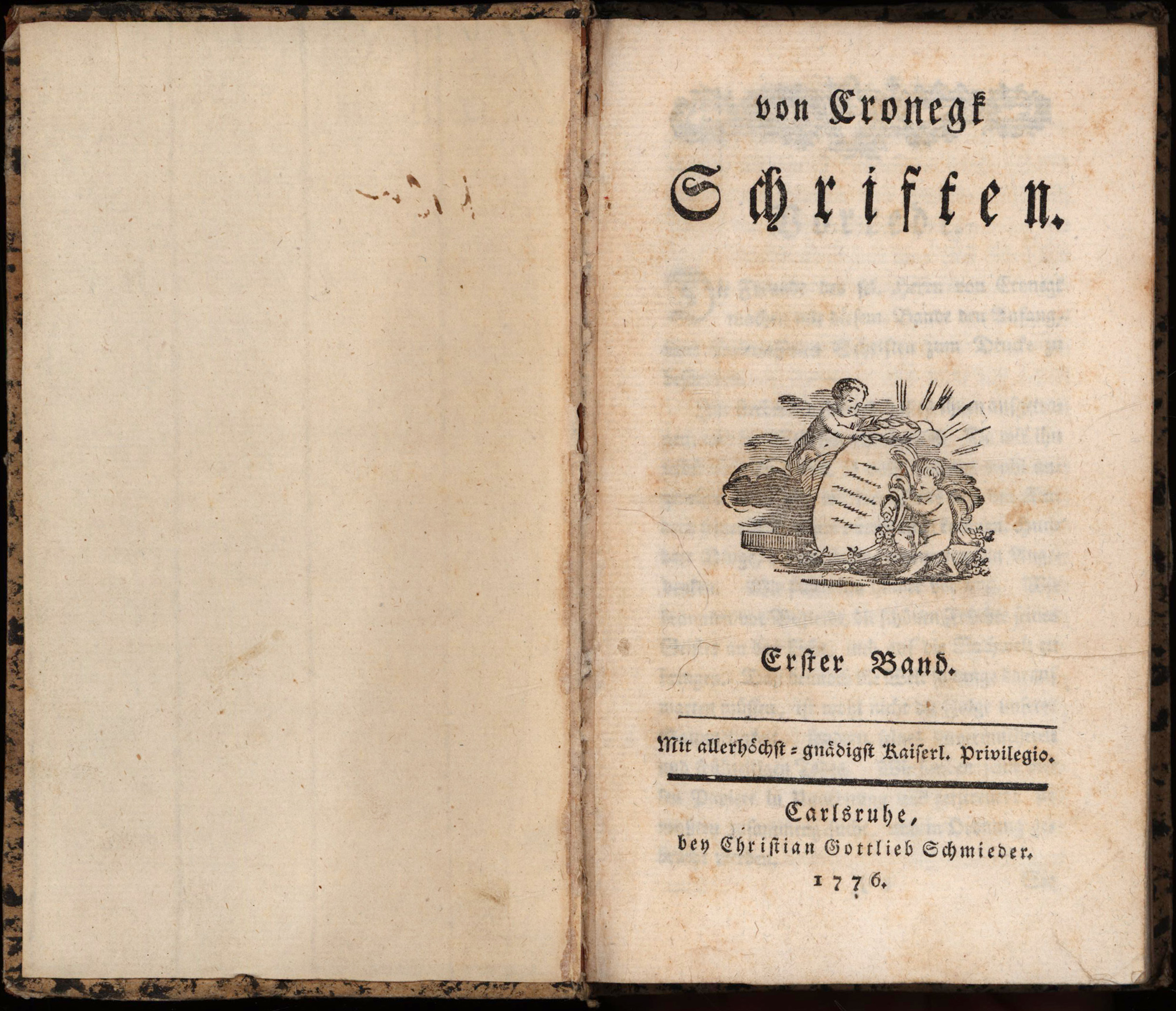 Cronegk, Johann Friedrich von: Des Freyherrn Johann Friederich von Cronegk sämtliche Schriften. Mit allerhöchst-gnädigst Kayserlichem Privilegio. 2 Bände. Carlsruhe, bey Christian Gottlieb Schmieder, 1776. Klein-8°. 17,5 x 11 cm. 11 Blatt, 414 und 2 Blatt, 330 Seiten. Halblederbände der Zeit in Papier eingeschlagen, mit goldgeprägten Rückentiteln auf braunen Lederschildchen.