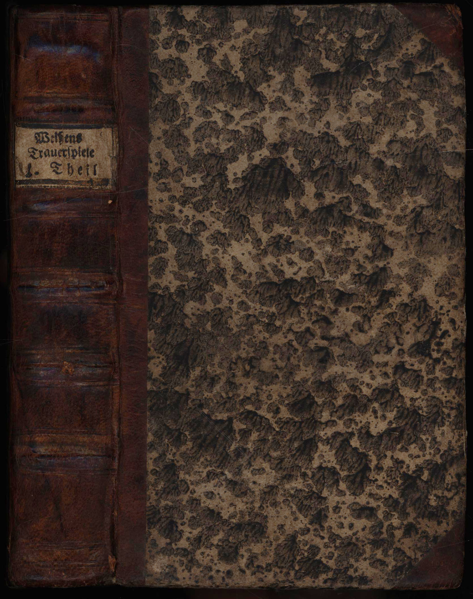 Weiße, Christian Felix: Trauerspiele. Erster Theil. Eduard der Dritte. Richard der Dritte. Krispus. Mustapha und Zeangir. Carlsruhe, Christian Gottlieb Schmieder, 1778. Klein-8°. 17,5 x 11 cm. 7 Blatt, 480 Seiten. Halblederband der Zeit mit marmoriertem Bezugspapier und rotem Farbschnitt.