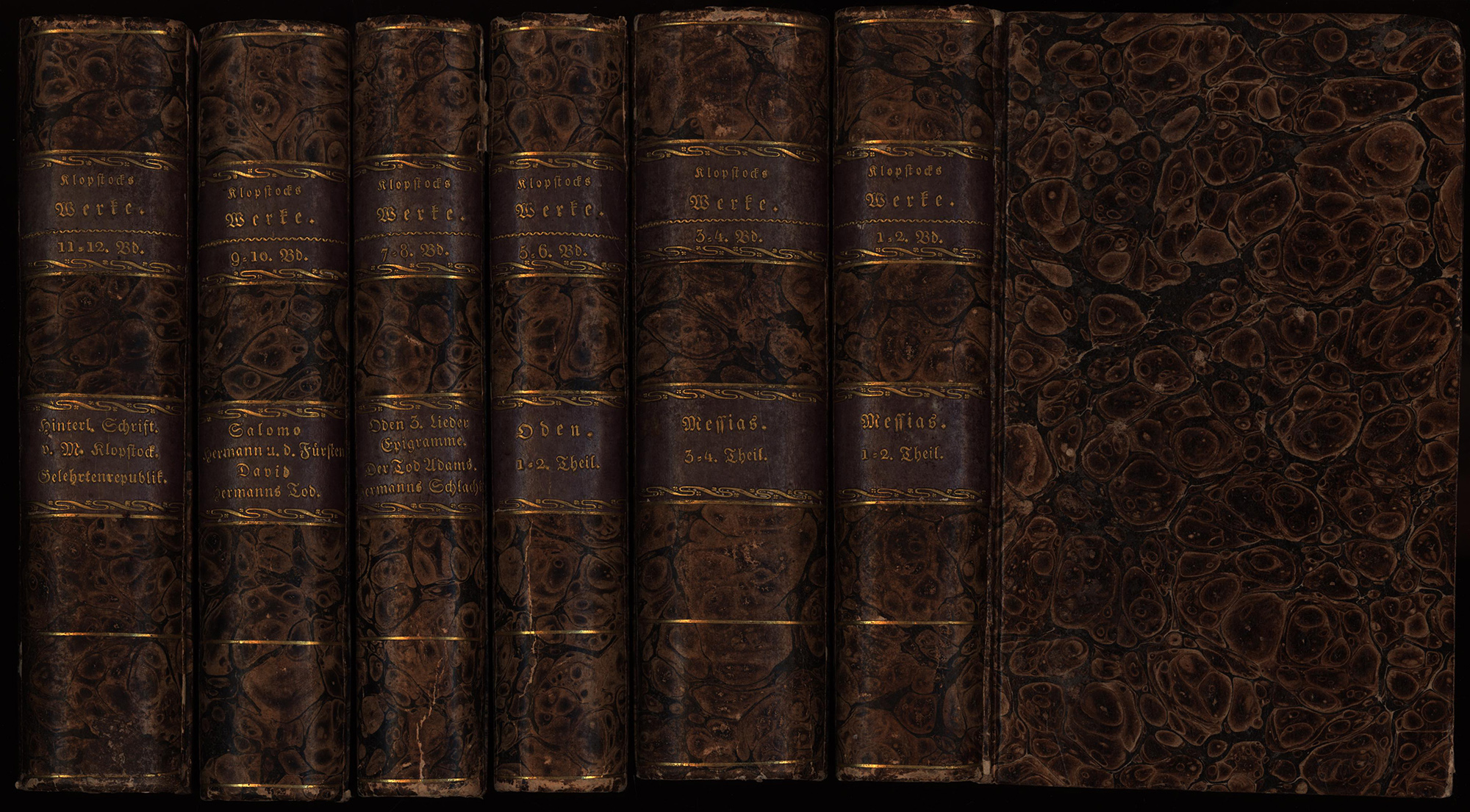 Klopstock, Friedrich Gottlieb: F. G. Klopstocks Werke. 12 Bände (in 6, komplett). Carlsruhe, Bureau der deutschen Klassiker, 1818-1822. 8°. 19 x 12 cm. 355, 295, 471, 351, VIII, 272, VIII, 247, 308, VIII, 215, IV, 322, 274, 250 und 380 Seiten. Pappbände der Zeit mit marmoriertem Bezugspapier, goldgeprägten Rückentiteln und gelben Rundumschnitten. (Sammlung der vorzueglichsten deutschen Classiker).