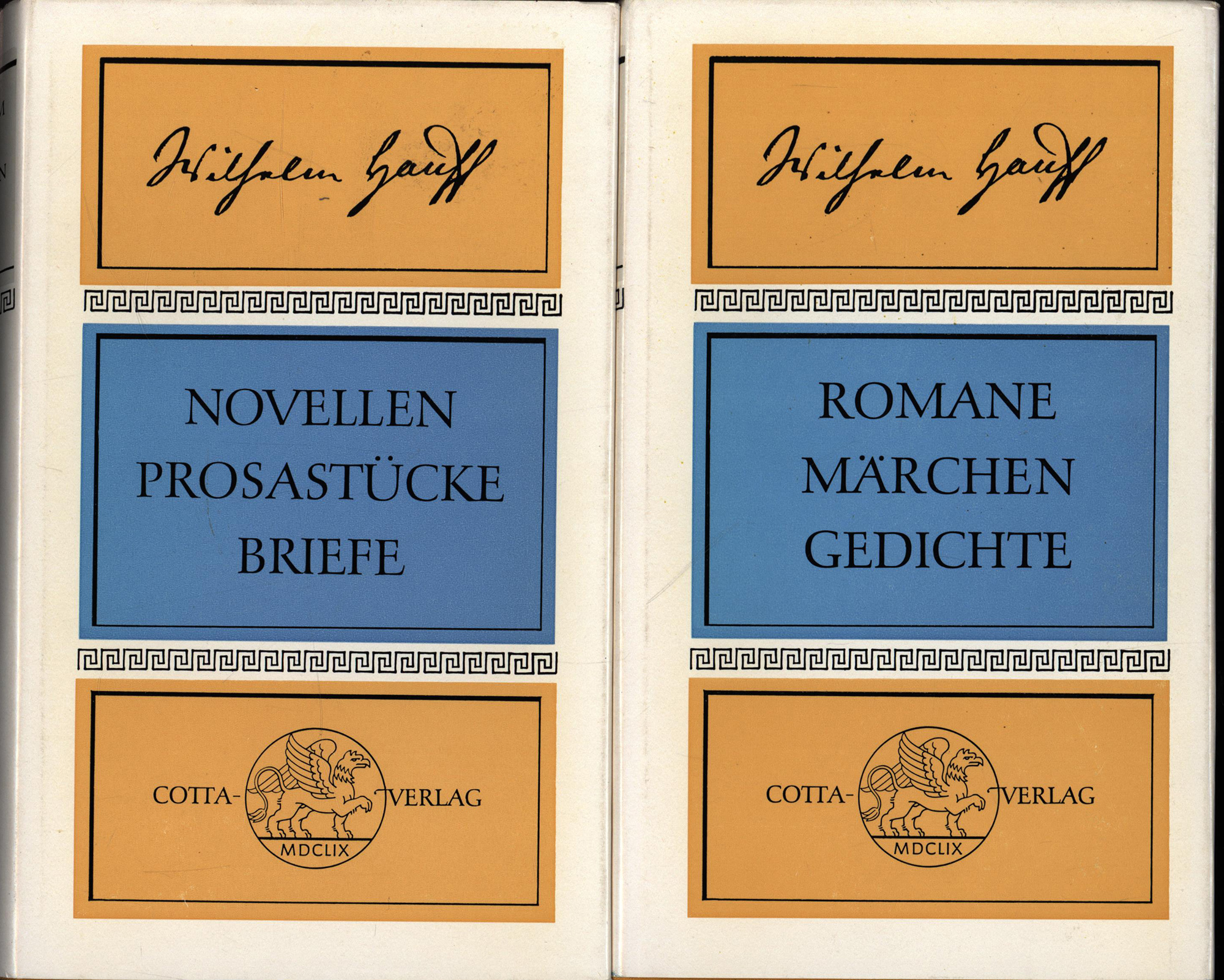 Hauff, Wilhelm; Engelhard, Hermann [Hrsg.]: Werke. Band I: Romane, Märchen, Gedichte. Band II: Novellen, Prosastücke, Briefe. Herausgegeben von Hermann Engelhard. 2 Bände (komplett). Stuttgart, Cotta, 1961 und 1962. 8°. 20 x 12 cm. 963, 1015 Seiten. Original-Leinenbände mit Original-Schutzumschlägen. Gelbe Kopfschnitte. Dünndruckausgabe.