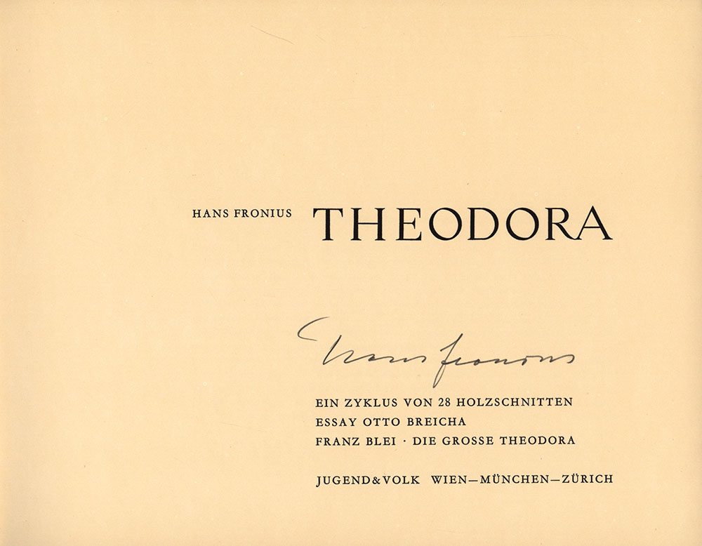 Fronius, Hans: Theodora. Ein Zyklus von 28 Holzschnitten. Essay: Otto Breicha. Franz Blei: Die große Theodora. [Signiertes Exemplar]. Wien, München und Zürich, Verlag für Jugend und Volk, 1969. Quer-8°. 24,5 x 31,5 cm. 23 (2) Seiten und 28 Tafeln. Original-Leinenband.
