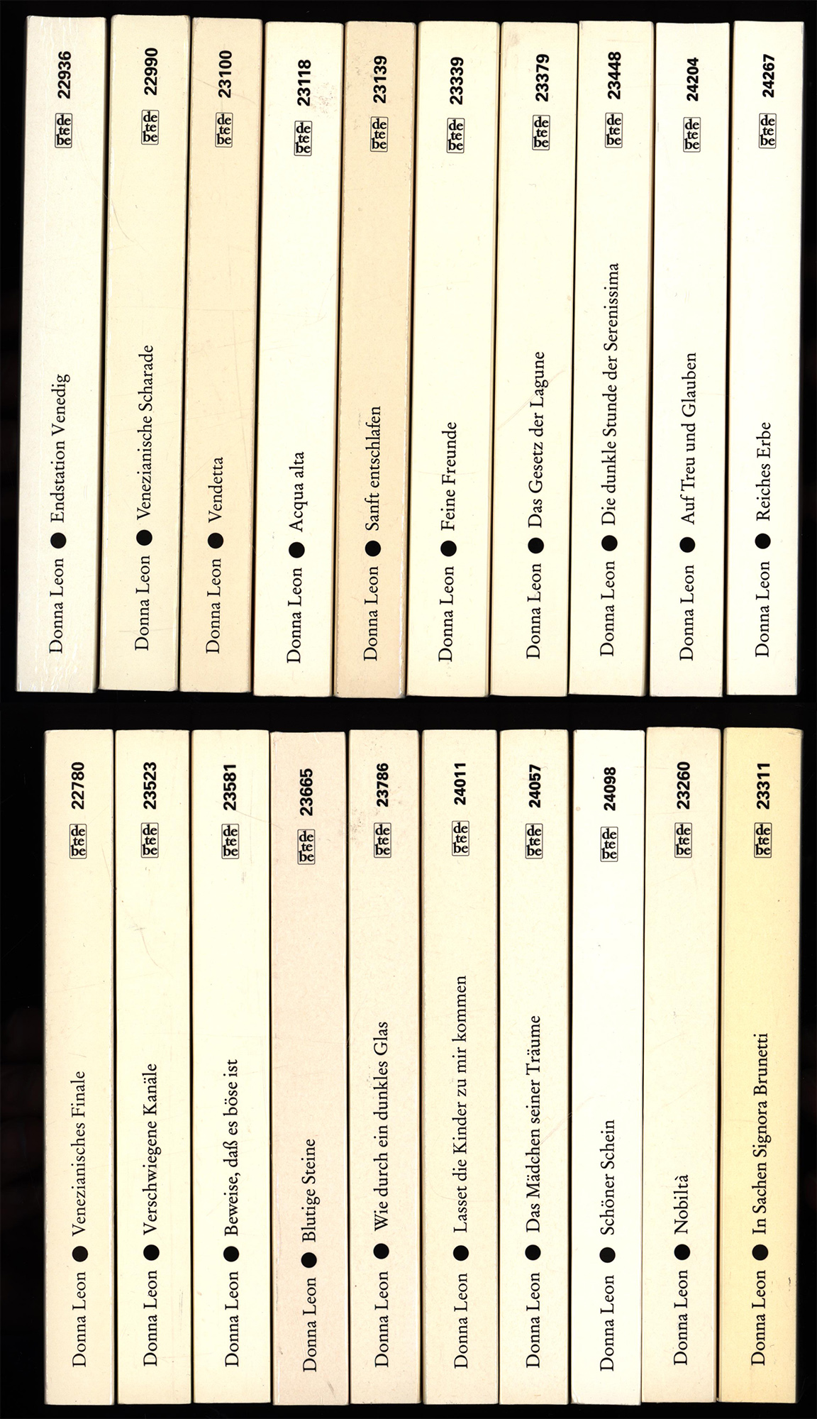 Leon, Donna: Konvolut von Commissario Brunetti, 1.-20. Fall. 1. Fall: Venezianisches Finale. 2. Fall: Endstation Venedig. 3. Fall: Venezianische Scharade. 4. Fall: Vendetta. 5. Fall: Acqua alta. 6. Fall: Sanft entschlafen. 7. Fall: Nobilita. 8. Fall: In Sachen Signora Brunetti. 9. Fall: Feine Freunde. 10. Fall: Das Gesetz der Lagune. 11. Fall: Die dunkle Stunde der Serenissima. 12. Fall: Verschwiegene Kanäle. 13. Fall: Beweise, dass es böse ist. 14. Fall: Blutige Steine. 15. Fall: Wie durch ein dunkles Glas. 16. Fall: Lasset die Kinder zu mir kommen. 17. Fall: Das Mädchen seiner Träume. 18. Fall: Schöner Schein. 19. Fall: Auf Treu und Glauben. 20. Fall: Reiches Erbe. 20 Bände. Zürich, Diogenes, 1995-2012. Klein-8°. 18 x 11 cm. 345, 395, 372, 350, 370, 336, 300, 310, 332, 321, 330, 373, 327, 364, 343, 354, 350, 344, 315, 316 Seiten. Original-Karton. (= Diogenes-Taschenbuch, Bände 22780, 22936, 22990, 23100, 23118, 23139, 23260, 23311, 23339, 23379, 23448, 23523, 23581, 23665, 23786, 24011, 24057, 24098, 24204, 24267).