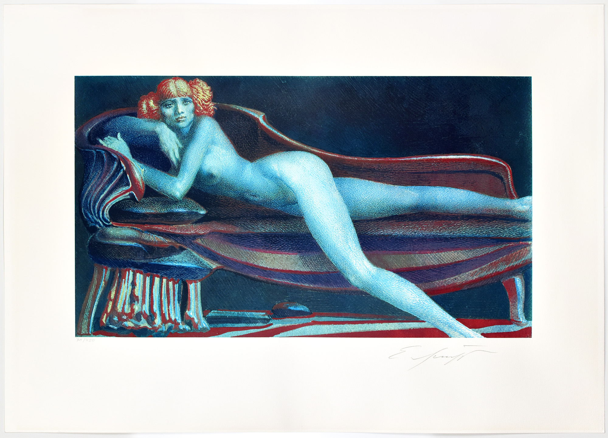 Fuchs, Ernst: Liegender Frauenakt. [Signierte Original-Farblithografie / signed original colored lithograph]. (Ernst Fuchs, geboren am 13. Februar 1930 in Wien, gestorben am 9. November 2015 ebenda. Österreichischer Maler, Grafiker, Bildhauer, Bühnenbildner, Komponist und Autor. Mitbegründer der Wiener Schule des Phantastischen Realismus).