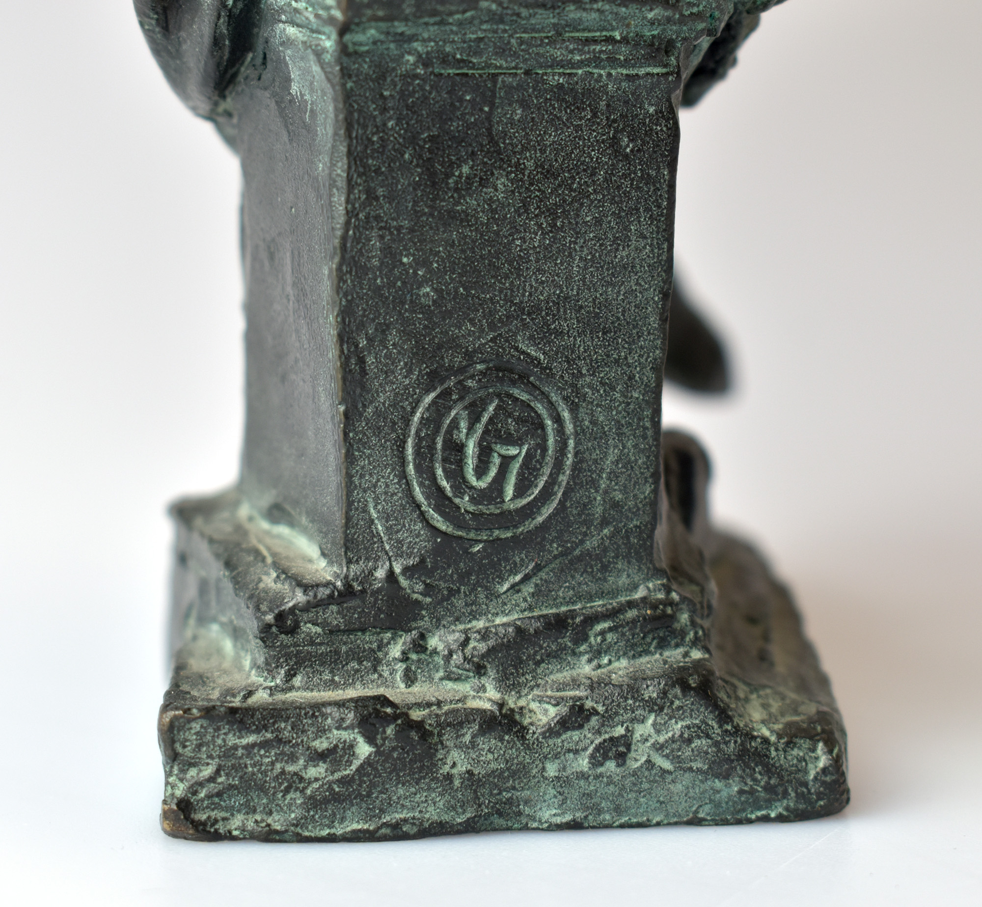Bronze sculpture with a dark patina. The cast bears Bert Gerresheim’s signature stamp on the side and a foundry stamp (cast by Schmäke Düsseldorf) on the underside. Dimensions: 22 x 13 x 9 cm. Weight: 2.88 kg. Very good condition.