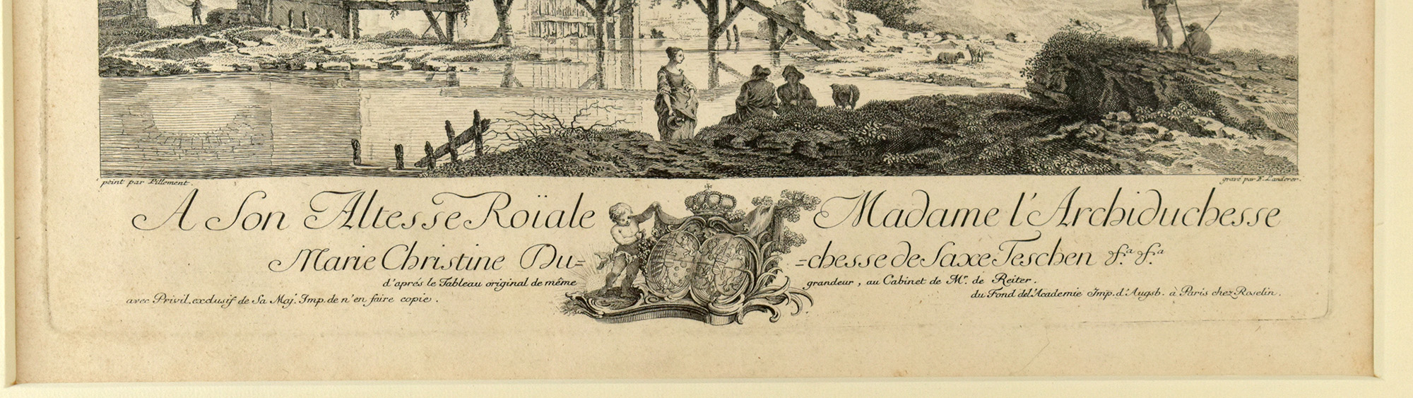 Original copper engraving by Ferdinand Landerer after Victor Pillemant, circa 1790, on laid paper. Below the image is a dedication to Archduchess Maria Christina of Saxony, in French. Professionally mounted by a gallery behind glass/passe-partout in a partially gilded wooden frame. Not examined ot of the frame. Image dimensions: 30.5 x 40.5 cm. Frame dimensions: 50.5 x 59.5 cm. The engraving and passe-partout have minimal foxing. Overall, in very good condition.