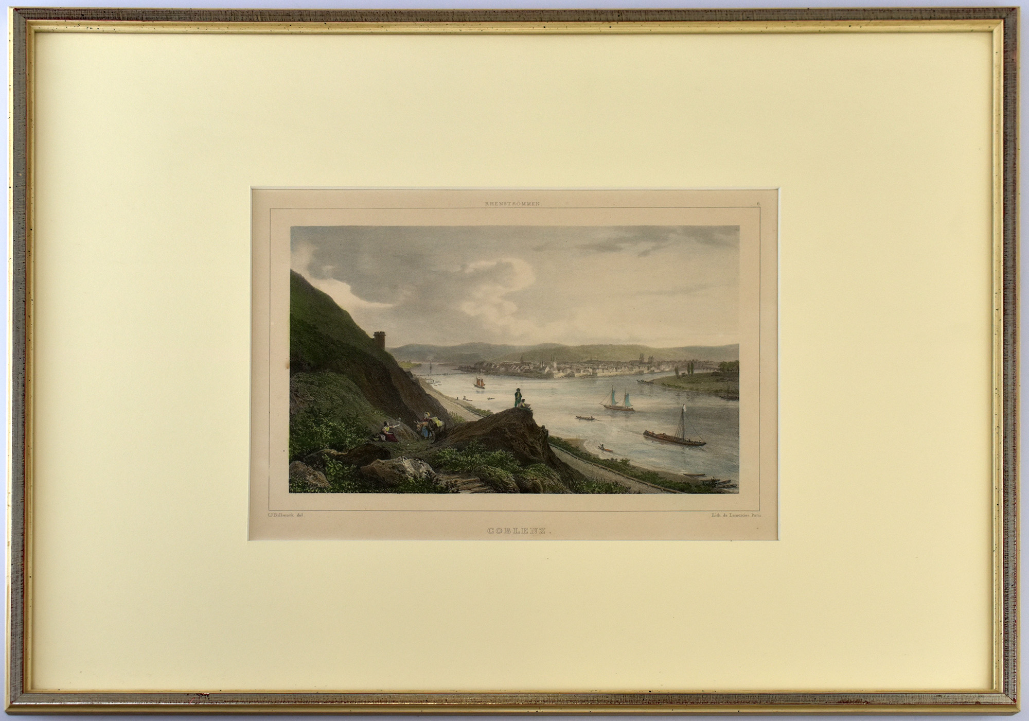 Kollorierte Original-Lithografie von Carl Johan Billmarkherausgegeben bei Lemercier, Paris 1837. Dekorative und schön kolorierte Ansicht vom nördlichen Rheinufer auf Koblenz, mit Rhein und Moselmündung. Auf dem Rhein hübsche Segelschiffsstaffage, im Vordergrund malerische Darstellung mit figürlicher Staffage. Professionell durch eine Galerie hinter Glas/Passepartout, im teils vergoldeten Holzrahmen gerahmt. Nicht ausgerahmt. Maße Abbildung: 18,2 x 25,4 cm. Maße Rahmen: 42,0 x 51,0 cm. Rahmen mit minimalen Gebrauchsspuren. Insgesamt sehr guter Zustand.