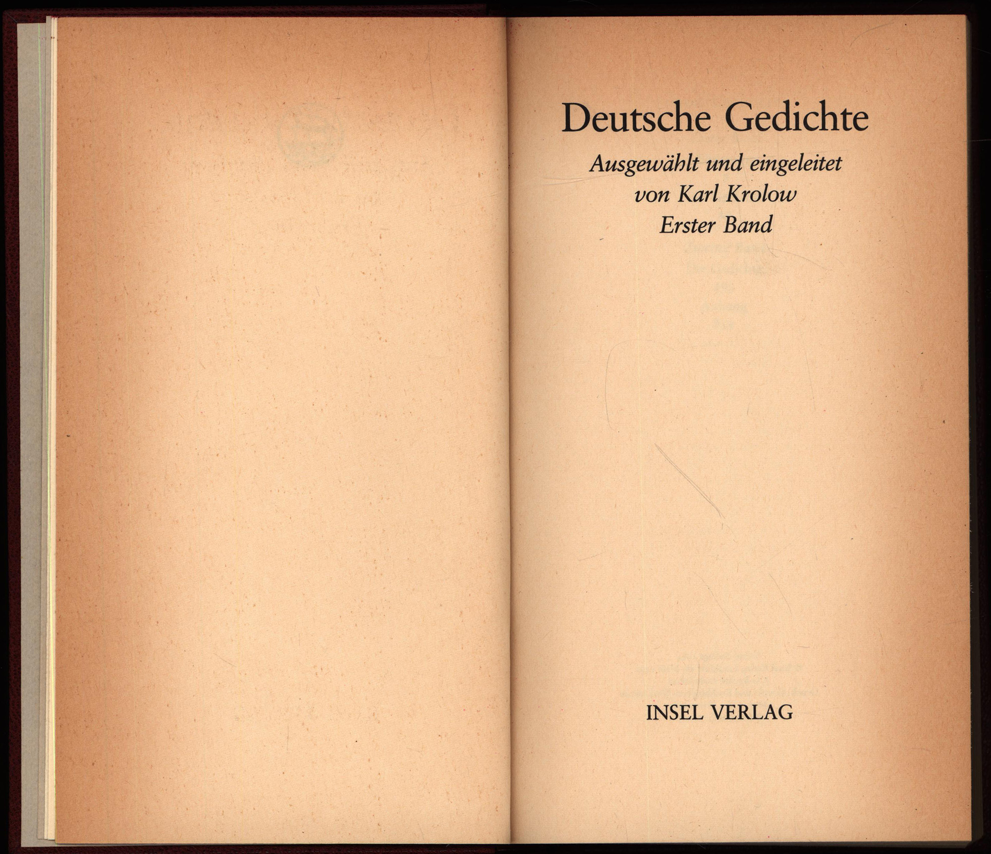 Krolow, Karl [Hrsg.]: Deutsche Gedichte. Ausgewählt und eingeleitet von Karl Krolow. 2 Bände. Frankfurt am Main, Insel-Verlag, 1984. 8°. 21 x 13 cm. 496, 497-921 Seiten. Lederbände mit goldgeprägten Rückentiteln und roten Kopfschnitten.
