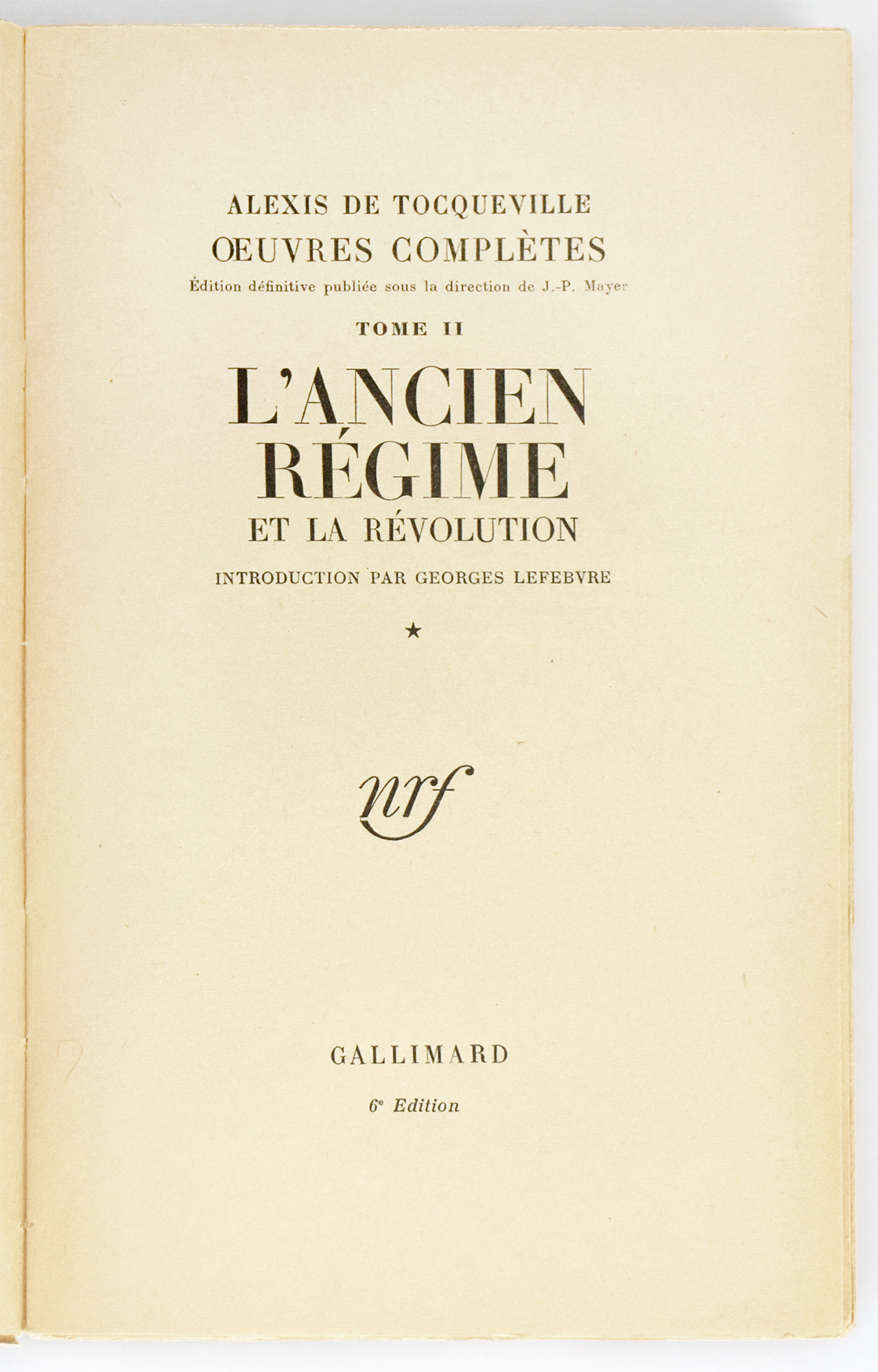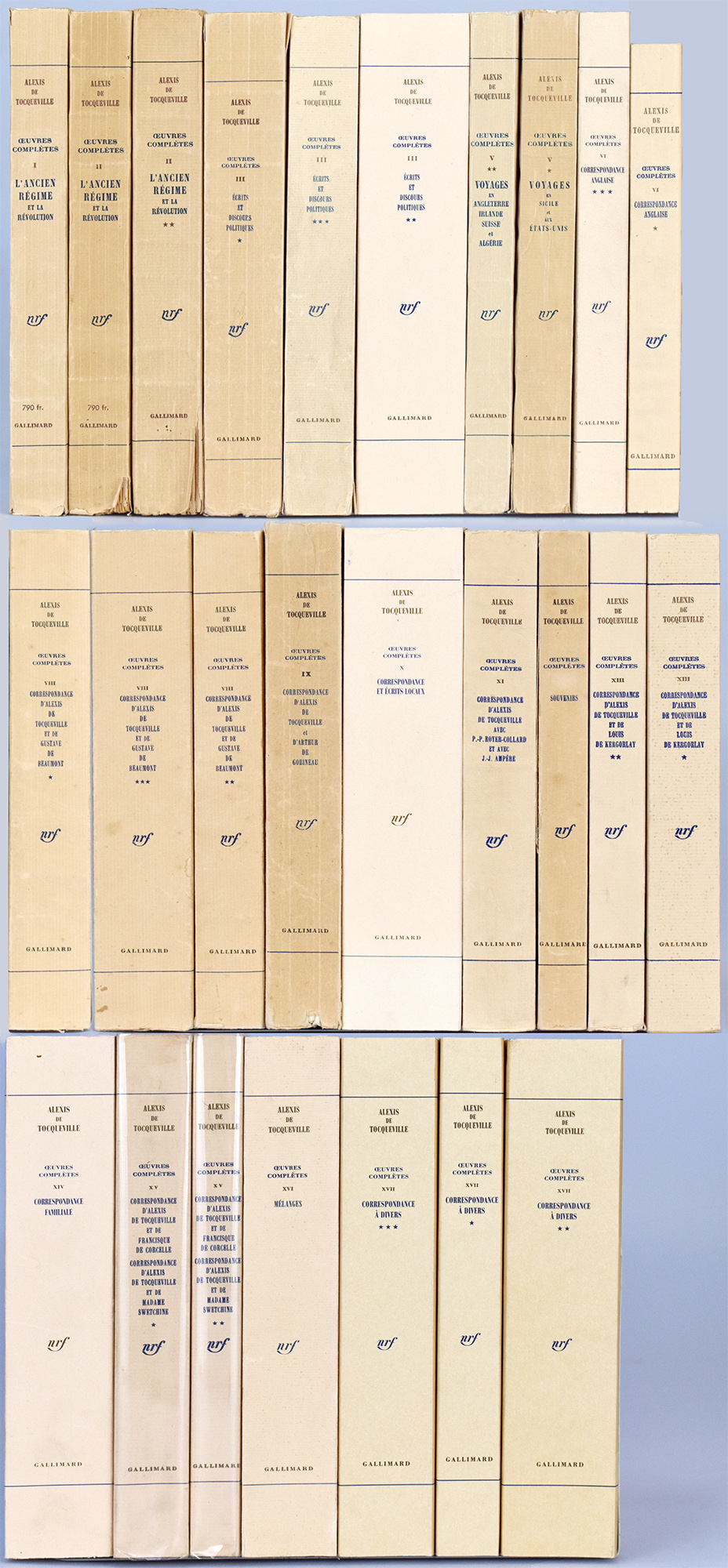 Tocqueville, Alexis de: Oeuvres complètes. Edition définitive publiée sous la direction de J.-P. Mayer. Band 1: Tome II, L’ Ancien Régime et la Révolution, Band 1-2 (in 3). Band 2: Tome III, Ecrits et discours politiques, Band 1-3. Band 3: Tome V, Band 1 und 2. Band 4: Tome VI, Correspondance anglaise, Band 1 und 3. Band 5: Tome VIII Correspondance d’Alexis de Tocqueville et de Gustave de Beaumont, Band 1-3. Band 6: Tome IX, Correspondance d’Alexis de Tocqueville et d’Arthur de Gobineau. Band 7: Tome X, Correspondance et écrits locaux. Band 8: Tome, XI, Correspondance d’Alexis de Tocqueville et de Pierre-Paul Royer-Collard. Correspondance d’Alexis de Tocqueville et de Jean-Jacques Ampère. Band 9: Tome XII, Souveniers. Band 10: Tome XIII, Correspondance d’Alexis de Tocqueville et de Louis de Kergorlay, Band 1 und 2. Band 11: Tome: XIV, Correspondance Familiale. Band 12: Tome XV, Correspondance d’Alexis de Tocqueville et de Francisque de Corcelle, Correspondance d’Alexis de Tocqueville et de Madame Swetchine, Band 1 und 2. Band 13: Tome XVI, Melanges. Band 14: Tome XVII, Correspondance à divers, Band 1-3. 14 Bände (in 26 von 27). Paris, Gallimard, 1952-2021. 8°. 23 x 14 cm. Ca. 12.800 Seiten. Original-Karton. Original-Klappenbroschuren. Schlichte Interimsbände.