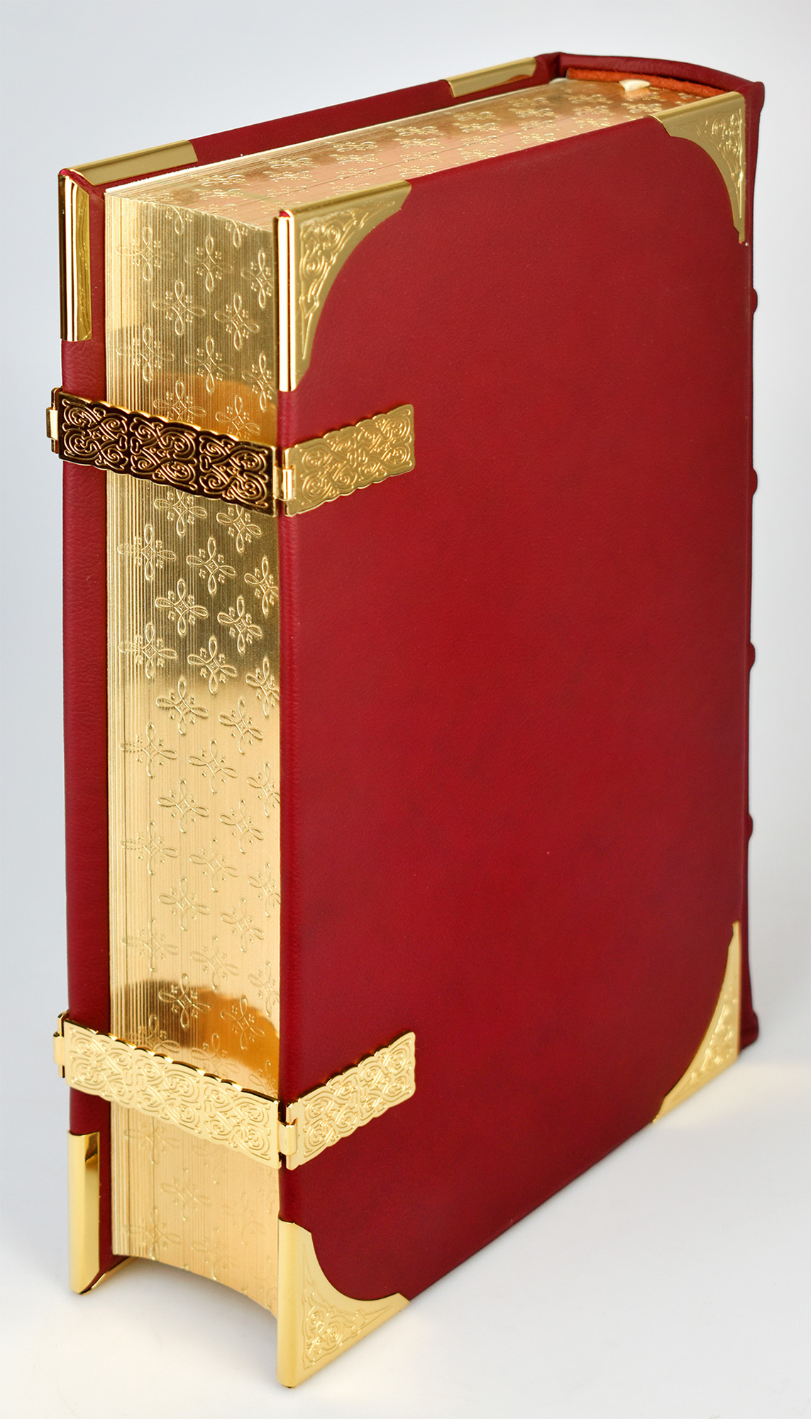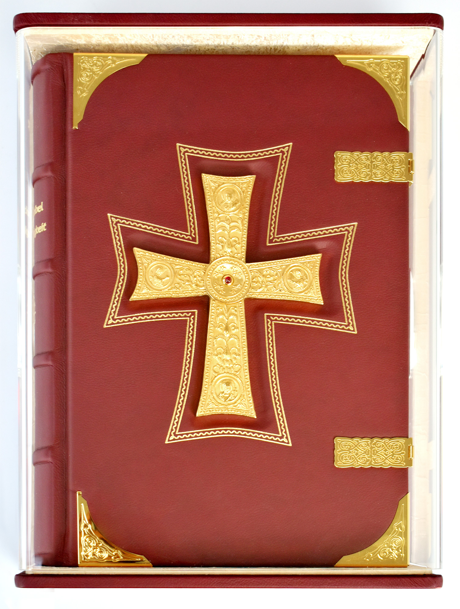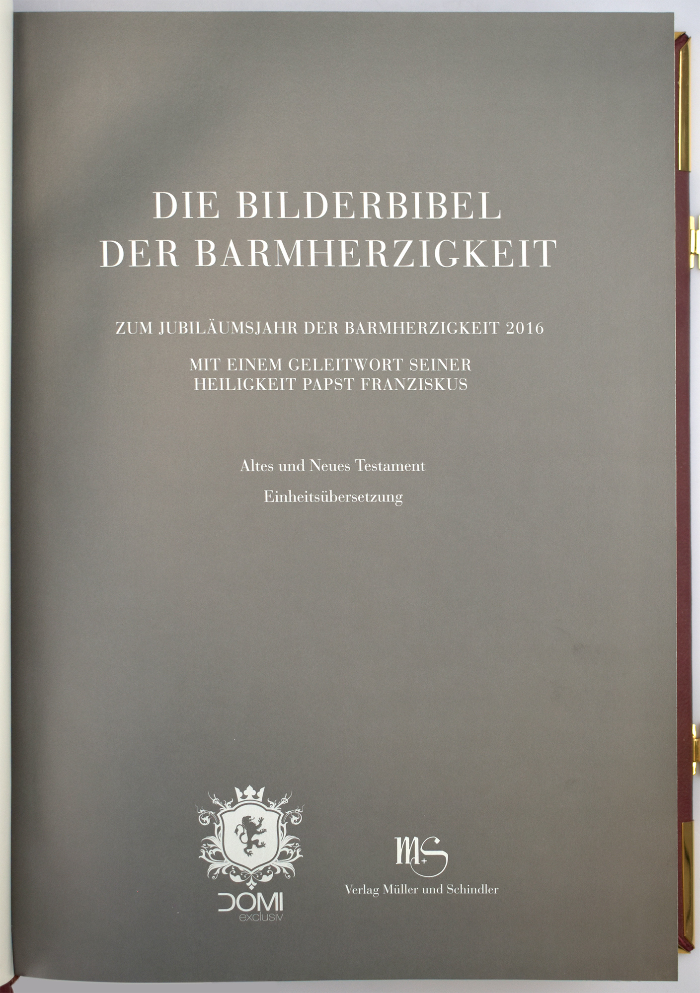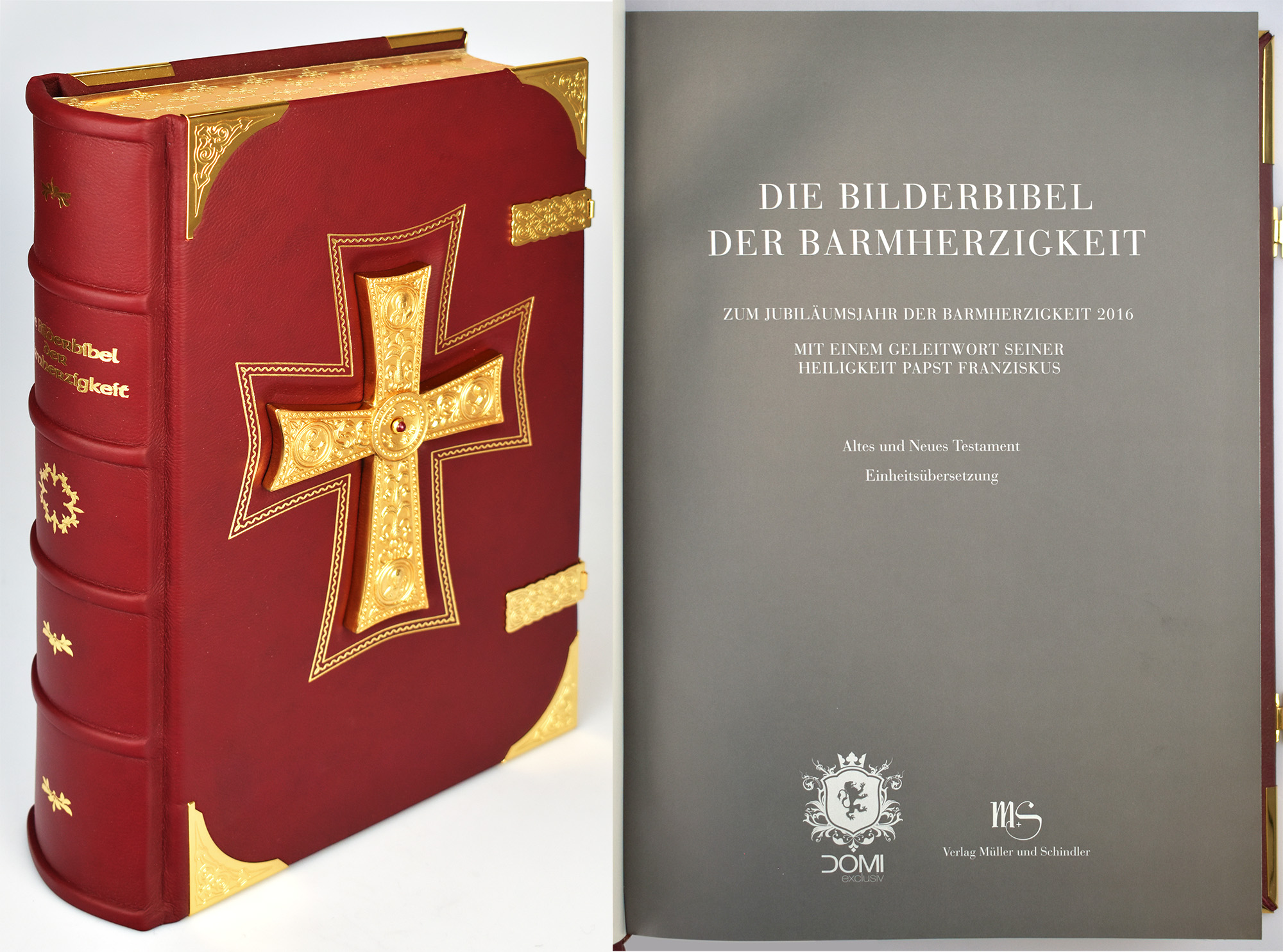 Bacher, Isolder [Bildredaktion]: Die Bilderbibel der Barmherzigkeit. Zum Jubiläumsjahr der Barmherzigkeit 2016. Altes und Neues Testament. Einheitsübersetzung. Wien, DOMI exklusiv, 2016. Groß-4°. 36 x 25 cm. Kassette 40 x 29 cm. 1011 Seiten, 13 ungezählte Seiten. Roter Original-Ganzlederband mit Rundum-Goldschnitt, zwei vergoldeten Schließen und acht vergoldeten Beschlägen sowie einem echtvergoldeten Kreuz mit Rubin auf dem Vorderdeckel. In Original-Acrylkassette.