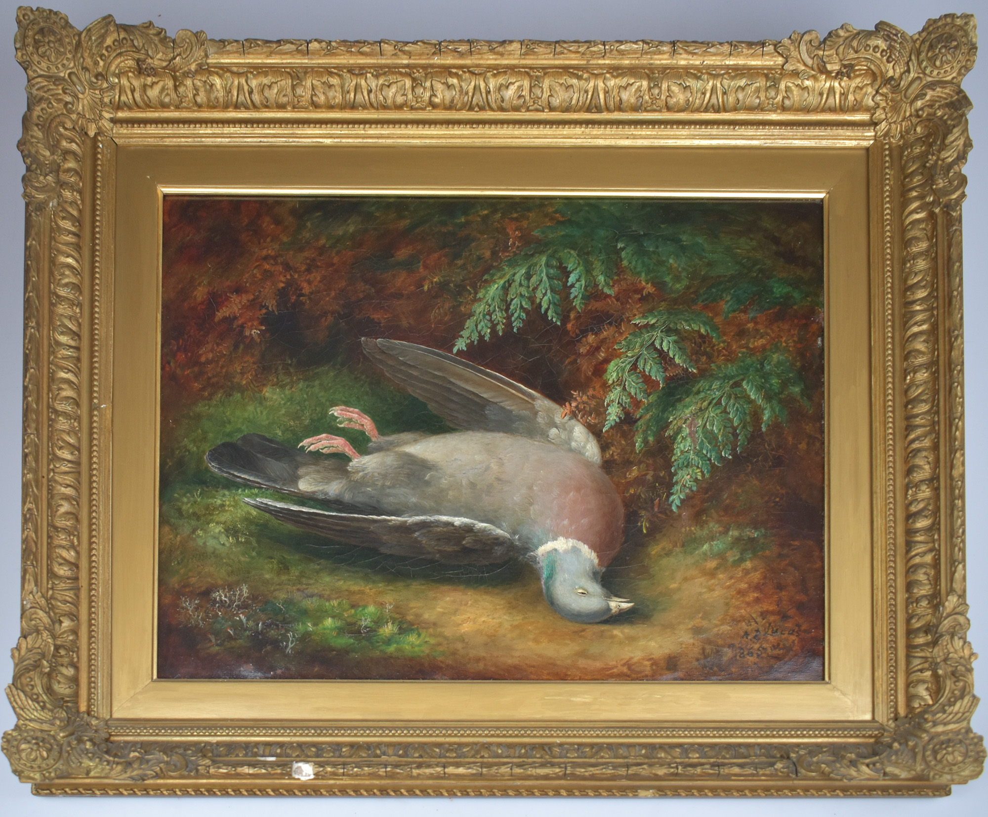Lucas, Albert Duerer: Stilleben mit Taube. 1865. [Öl auf Leinwand, gerahmt / oil on canvas, framed]. (Albert Duerer Lucas, geboren 1828, gestorben 1918. Englischer Maler).