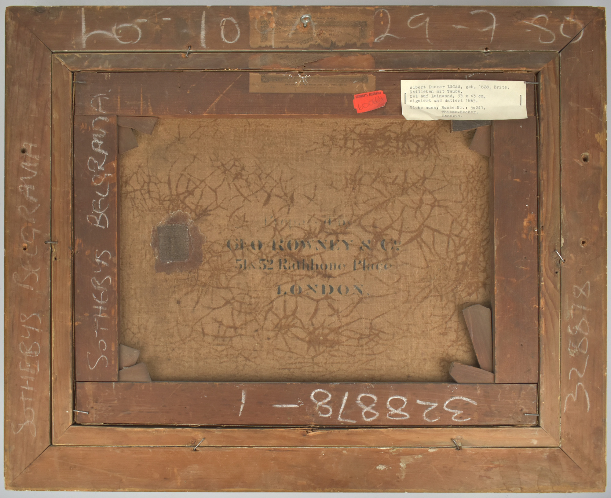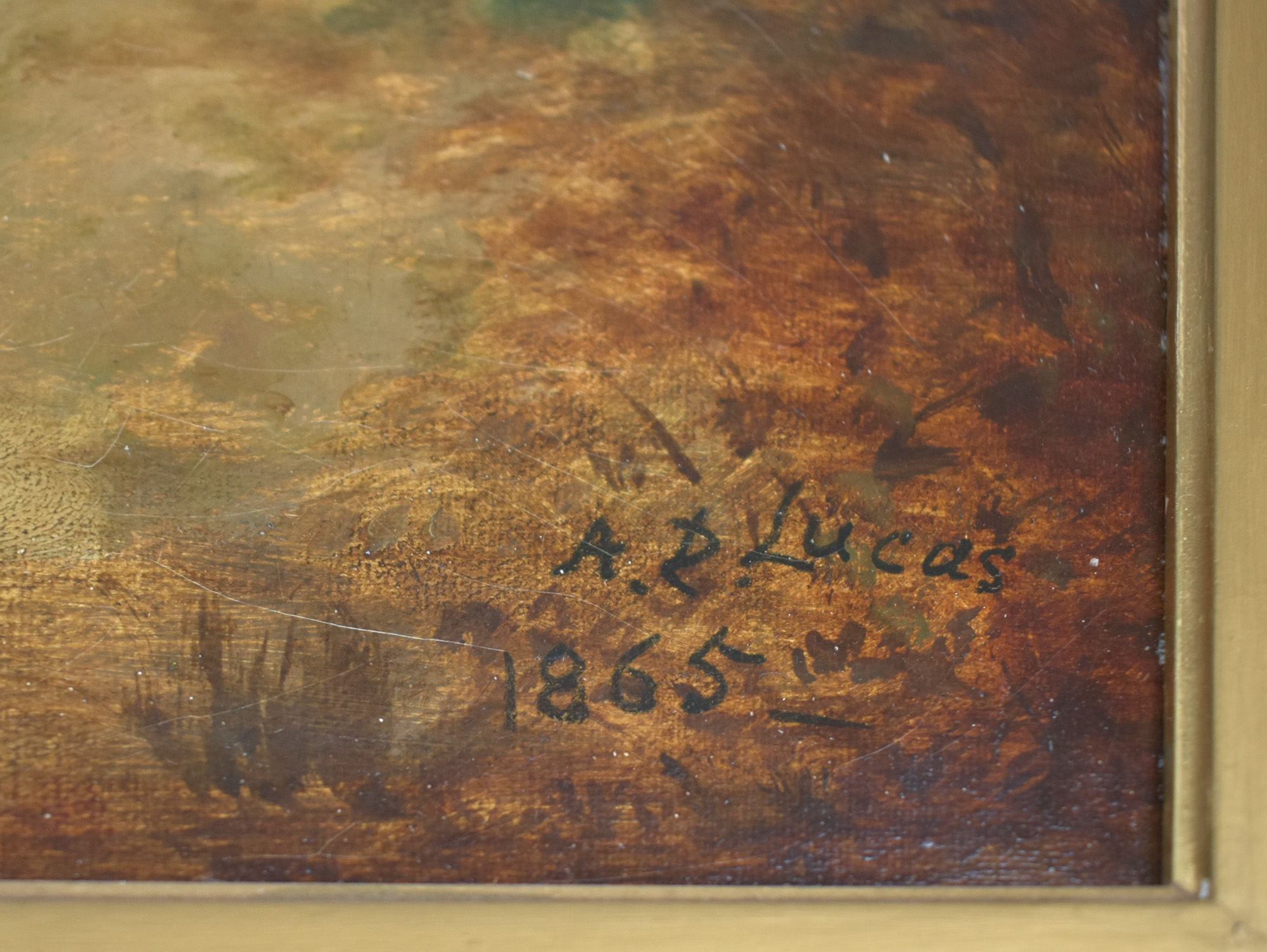 Oil on canvas, by Albert Duerer Lucas, signed and dated (1865) in black in the lower right corner. Framed in an opulent, antique, gilt wooden frame. Image dimensions: 34.0 x 44.0 cm. Frame dimensions: 50.0 x 60.0 cm. The frame shows signs of wear, with minor chips. The painting has a small, barely visible, restored tear with minimal paint loss. Several older labels and inscriptions, including one from Sotheby’s Belgravia, are affixed to the reverse of the frame. Overall, the painting is in very good condition.