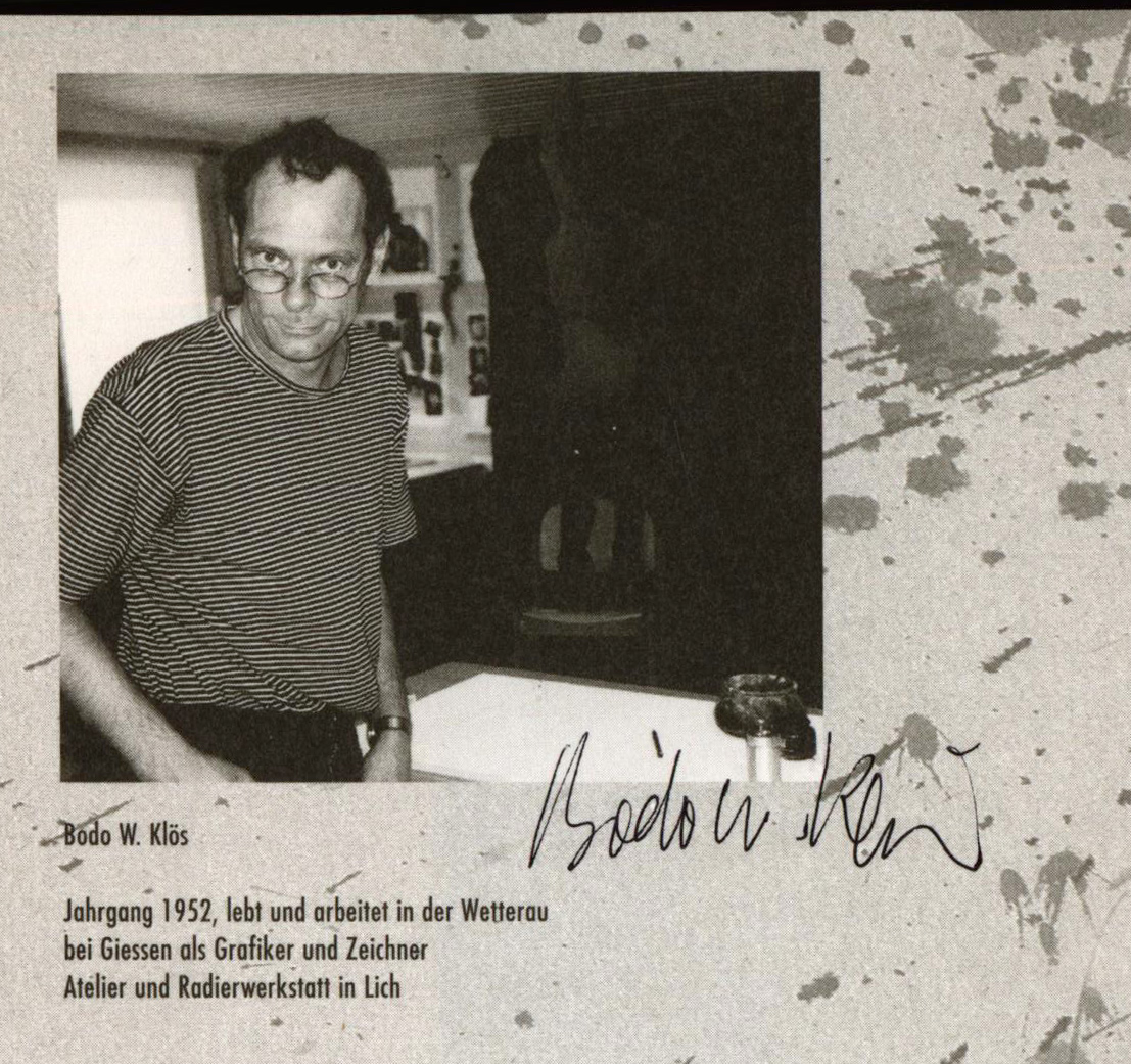 Nummer 240 einer nicht angegebenen Auflage, von Bodo W. Klös signiert. Beiliegend eine signierte und mit 193/200 nummerierte Original-Radierung von Bodo W. Klös auf einem gefalteten Blatt mit Prägestempel, gefaltete Blattmaße: 23 x 15,6 cm; Abbildungsmaße: 16,7 x 8,8 cm. Mit zahlreichen Illustrationen. Sehr gutes Exemplar.